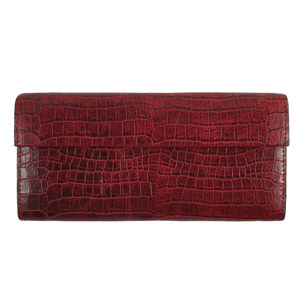Гаманець виконаний з натуральної матової шкіри з тисненням під рептилію, бордового кольору.
