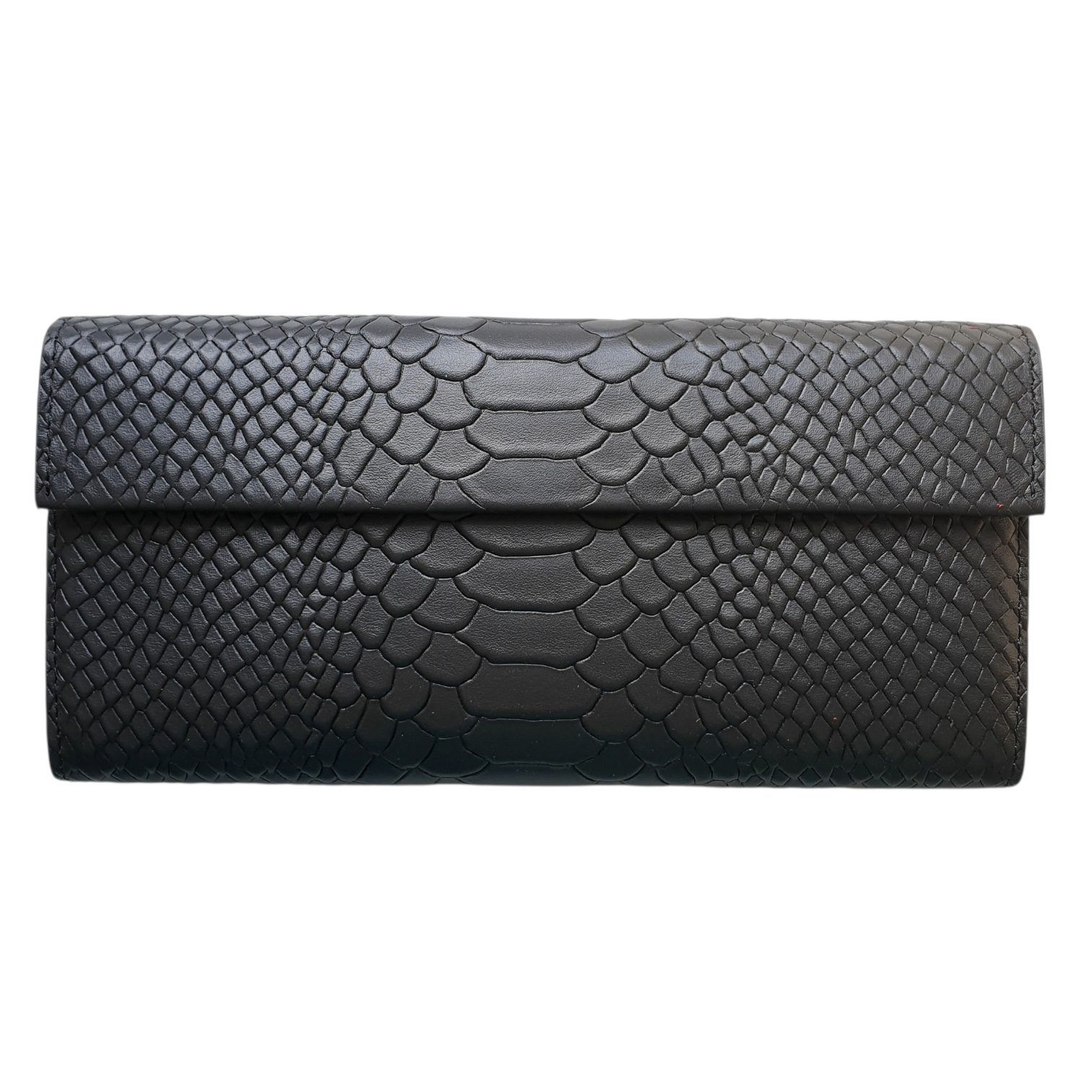 Гаманець виконаний з натуральної шкіри з тисненням під пітона, чорного кольору.