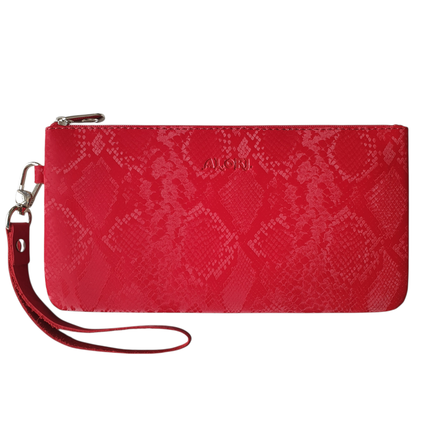 Гаманець-клатч виконаний з натуральної шкіри зі зміїним принтом, голографіками, червоного кольору.