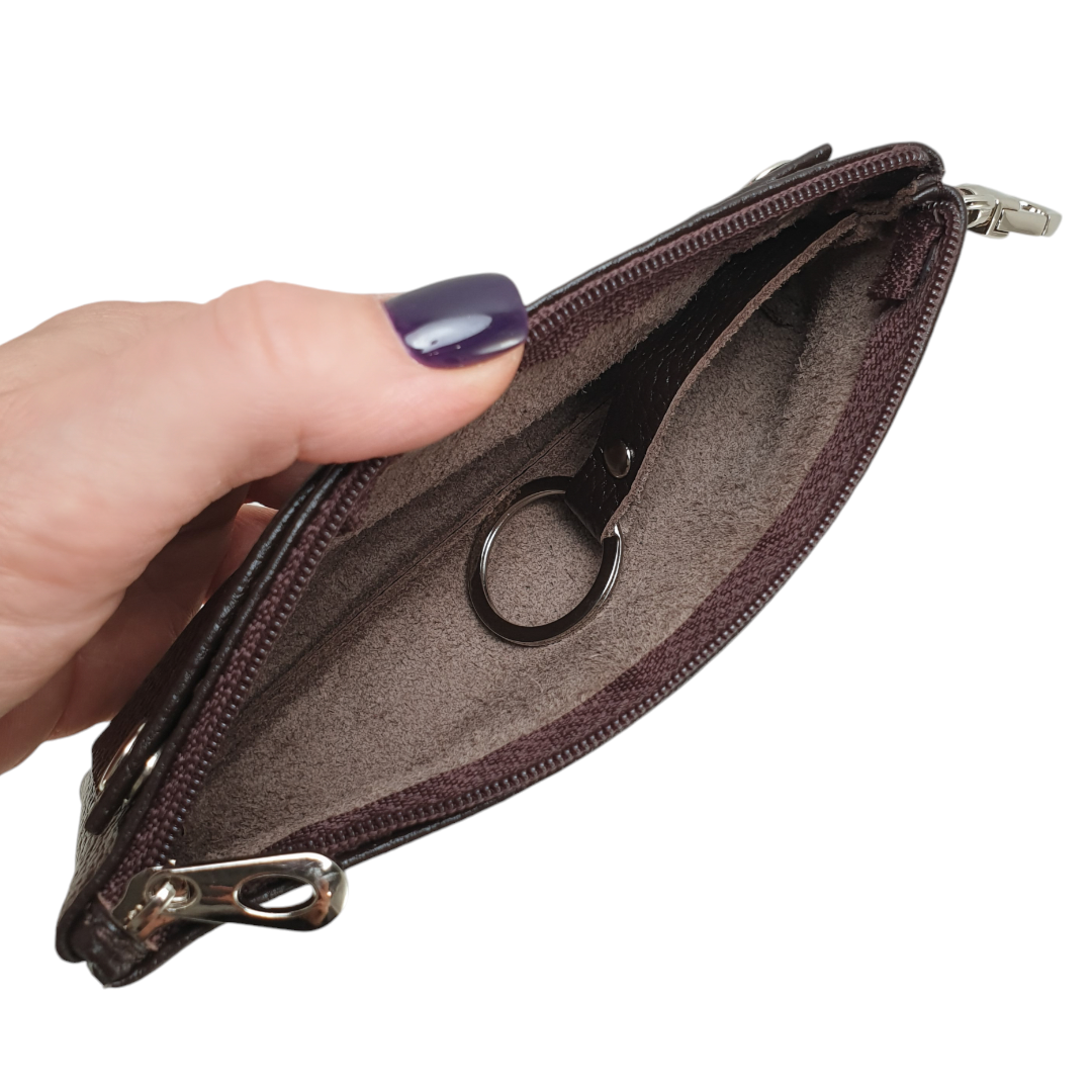 Ключі одягаються на кільце і ховаються всередині, ключниця закривається на блискавку. Зовні додатковий відділ з 4 карабінами, який застібається на 3 кнопки.