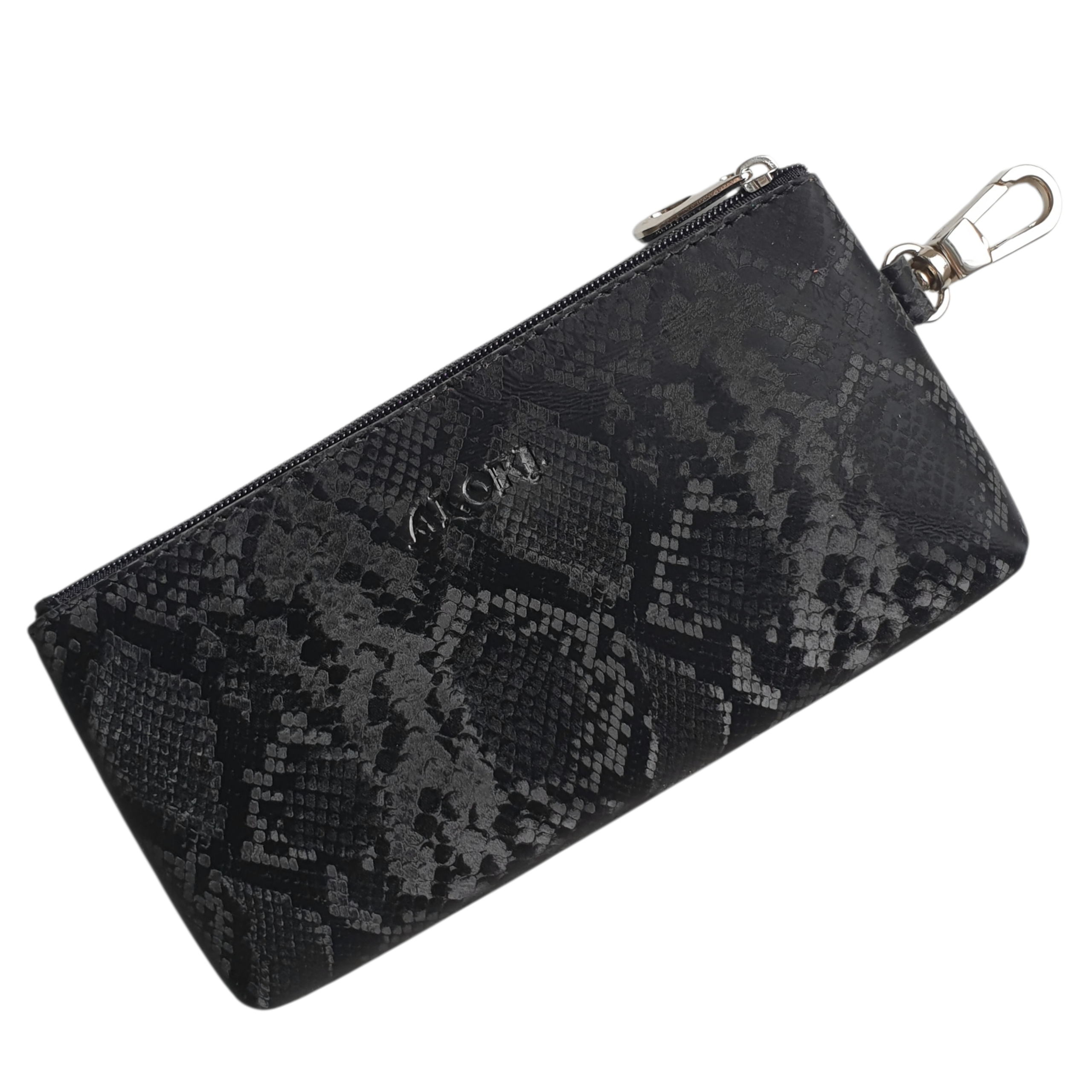 Ключниця виготовлена натуральної шкіри з тисненням під рептилію, з ефектом голографік, чорного кольору.