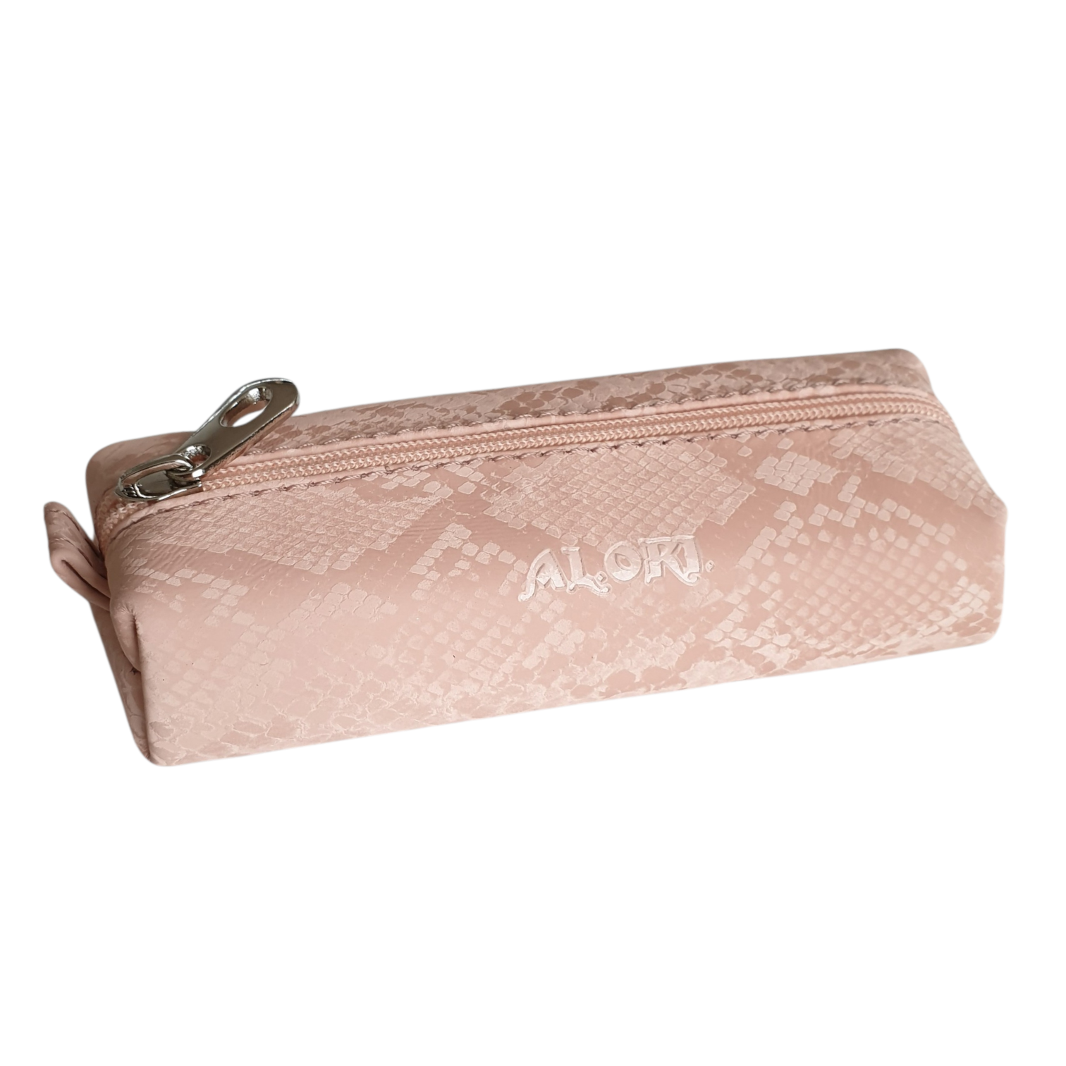 Компактна ключниця виготовлена ​​з натуральної шкіри зі зміїним принтом, з голографічним ефектом, пудрового кольору.