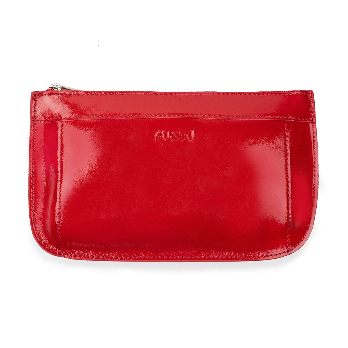 Косметичка выполнена из натуральной гладкой лаковой кожи, красного цвета. 1 большой отдел.Без тканевой подкладки. Тип застёжки – молния. Размер: 19,5х11см.