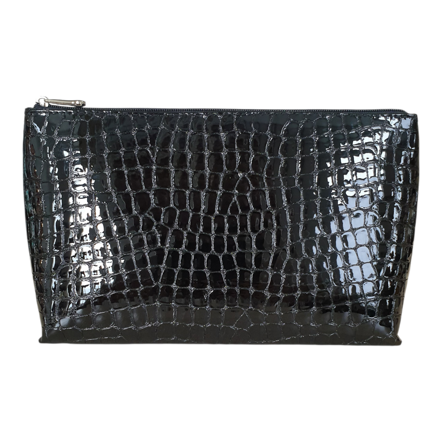 Косметичка виготовлена з натуральної шкіри, чорного кольору з тисненням під рептилію.