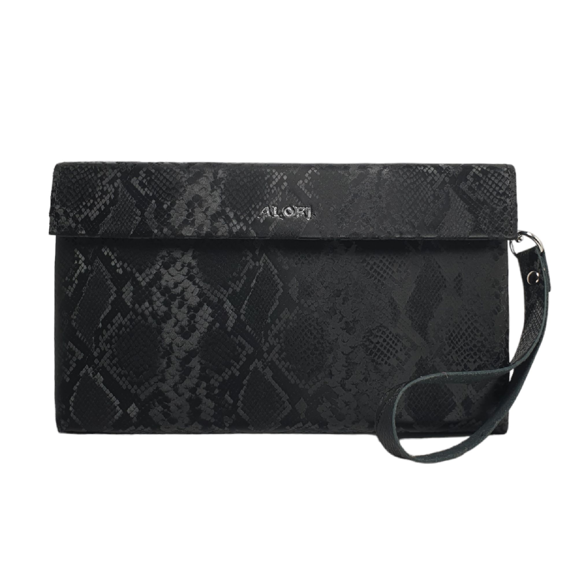 Косметичка-клатч виконана з натуральної шкіри зі зміїним принтом, голографік, чорного кольору