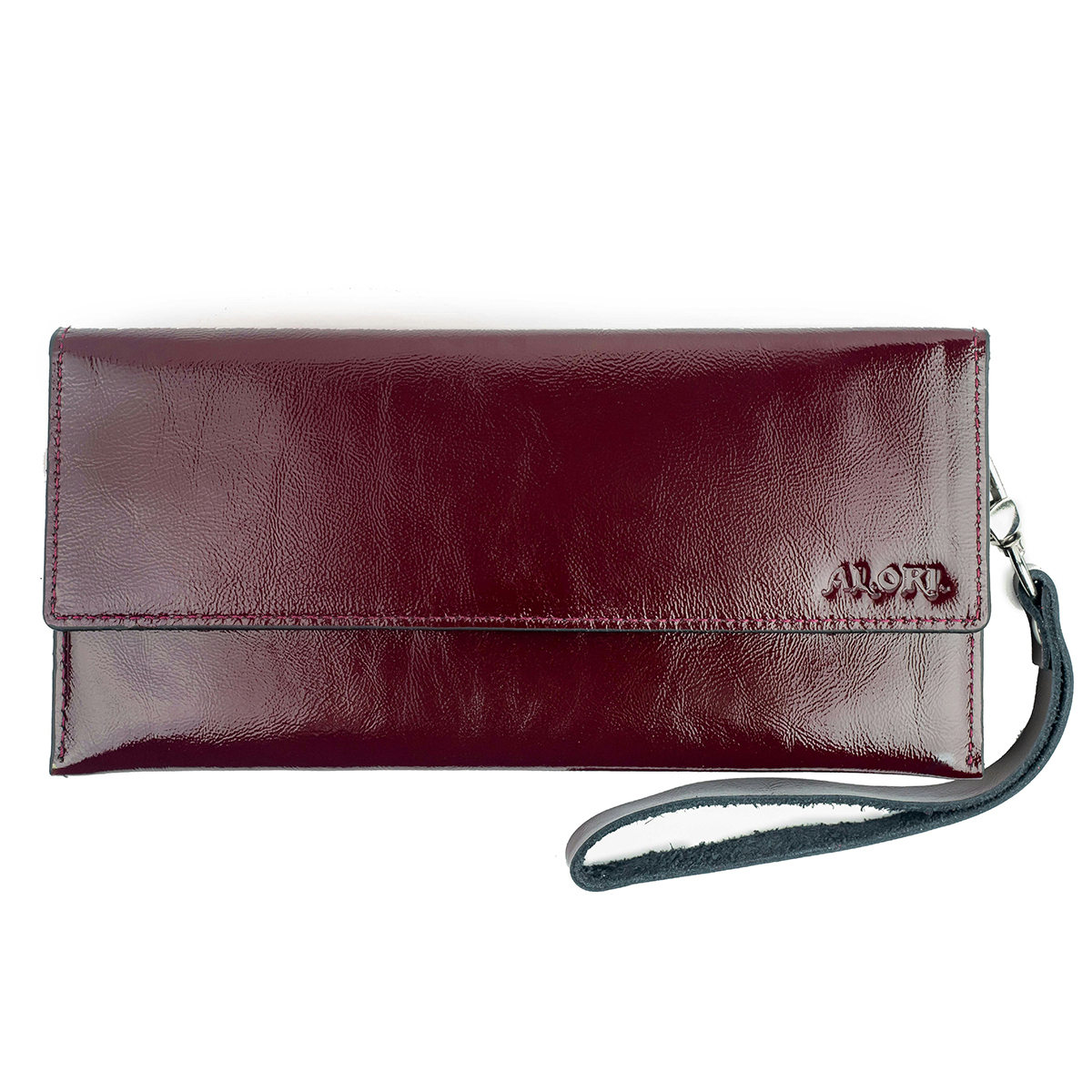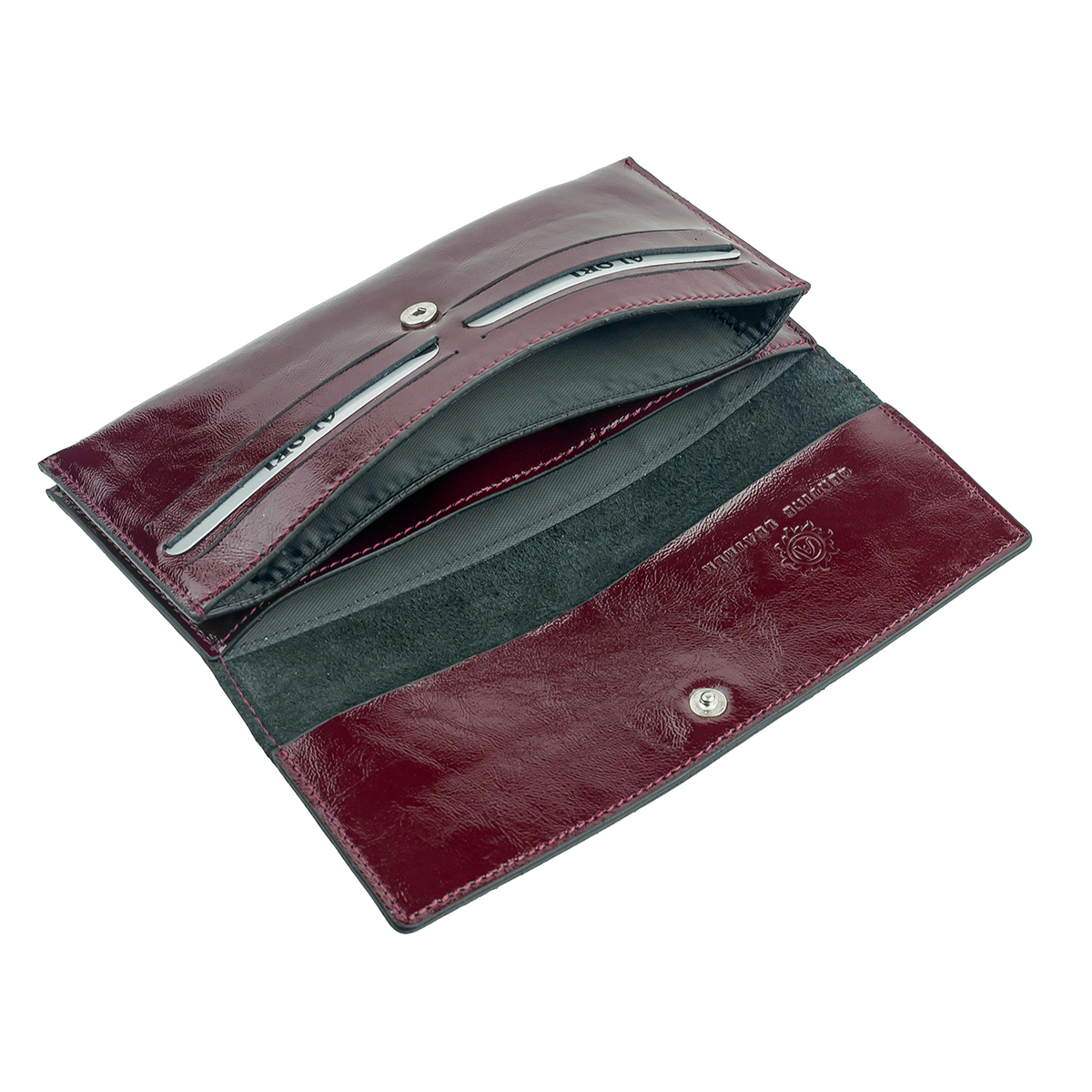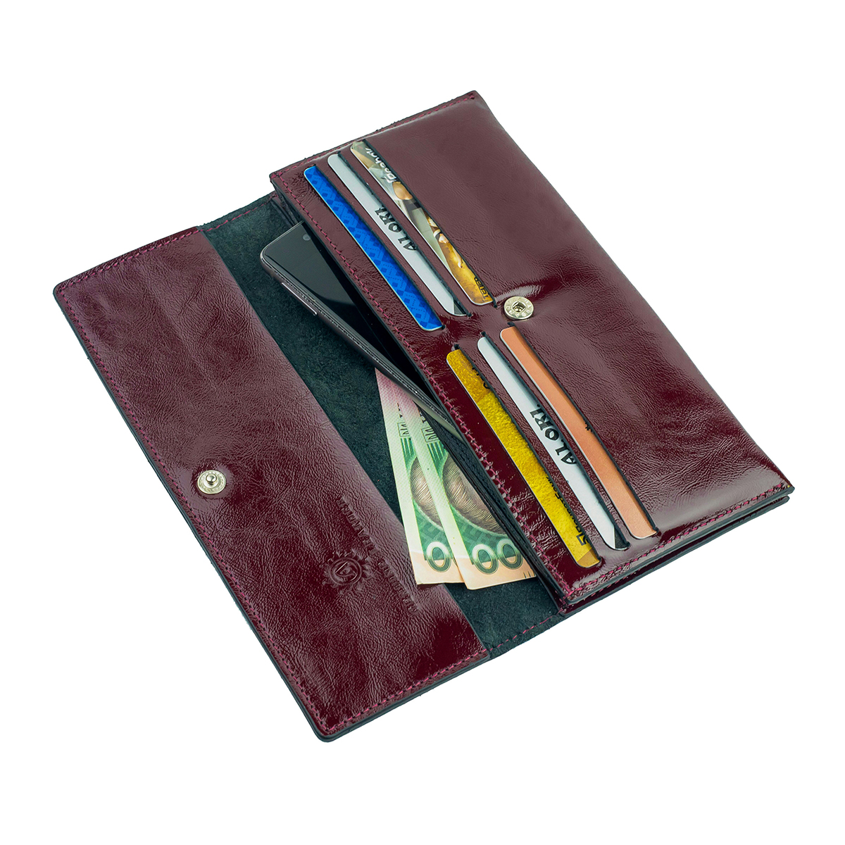 Гаманець виконаний з натуральної гладкої лакової шкіри бордового кольору.