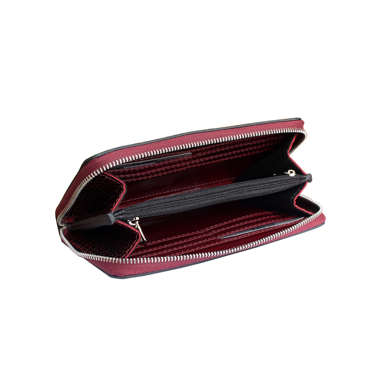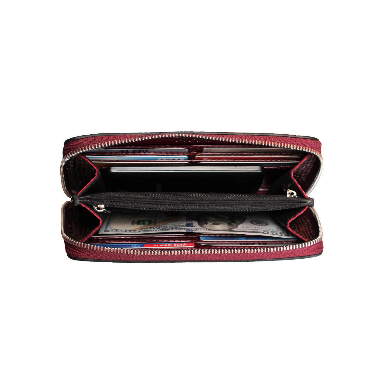 2 основних відділи для купюр посередині (телефон міститься), 2 додаткові відділи для купюр з боків, 2 кишені на блискавці, 12 осередків для пластикових карток, 1 відділ для різних дрібниць.