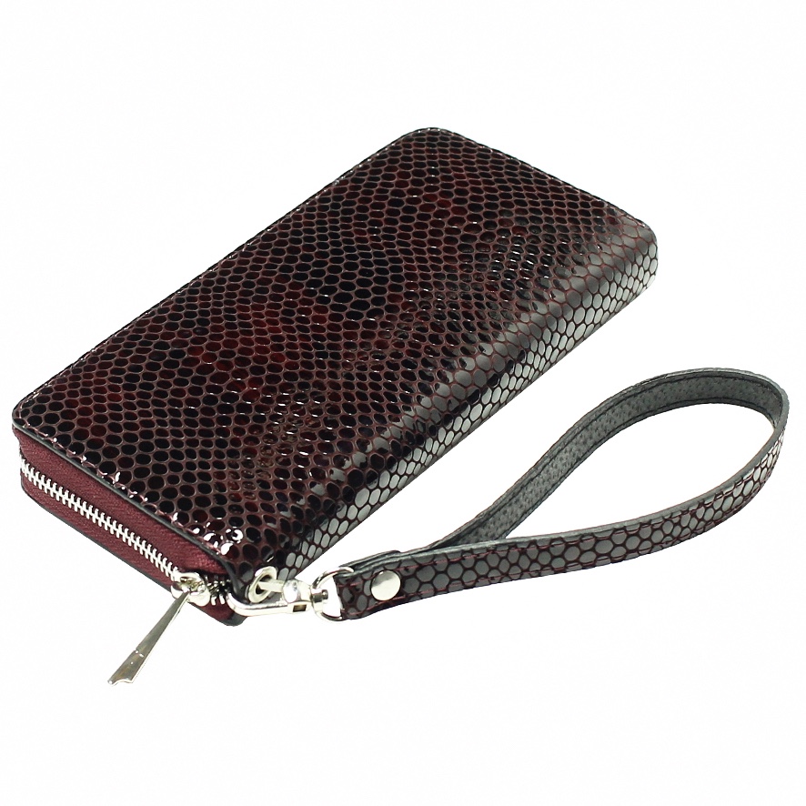 Гаманець виконаний з натуральної лакової шкіри із тисненням під рептилію, бордового кольору.