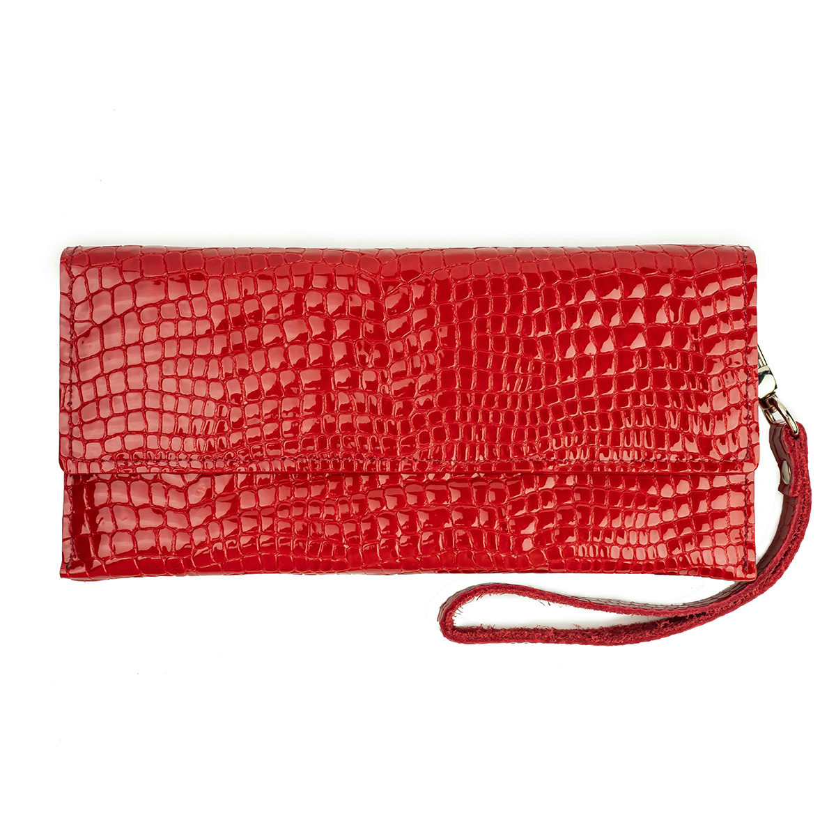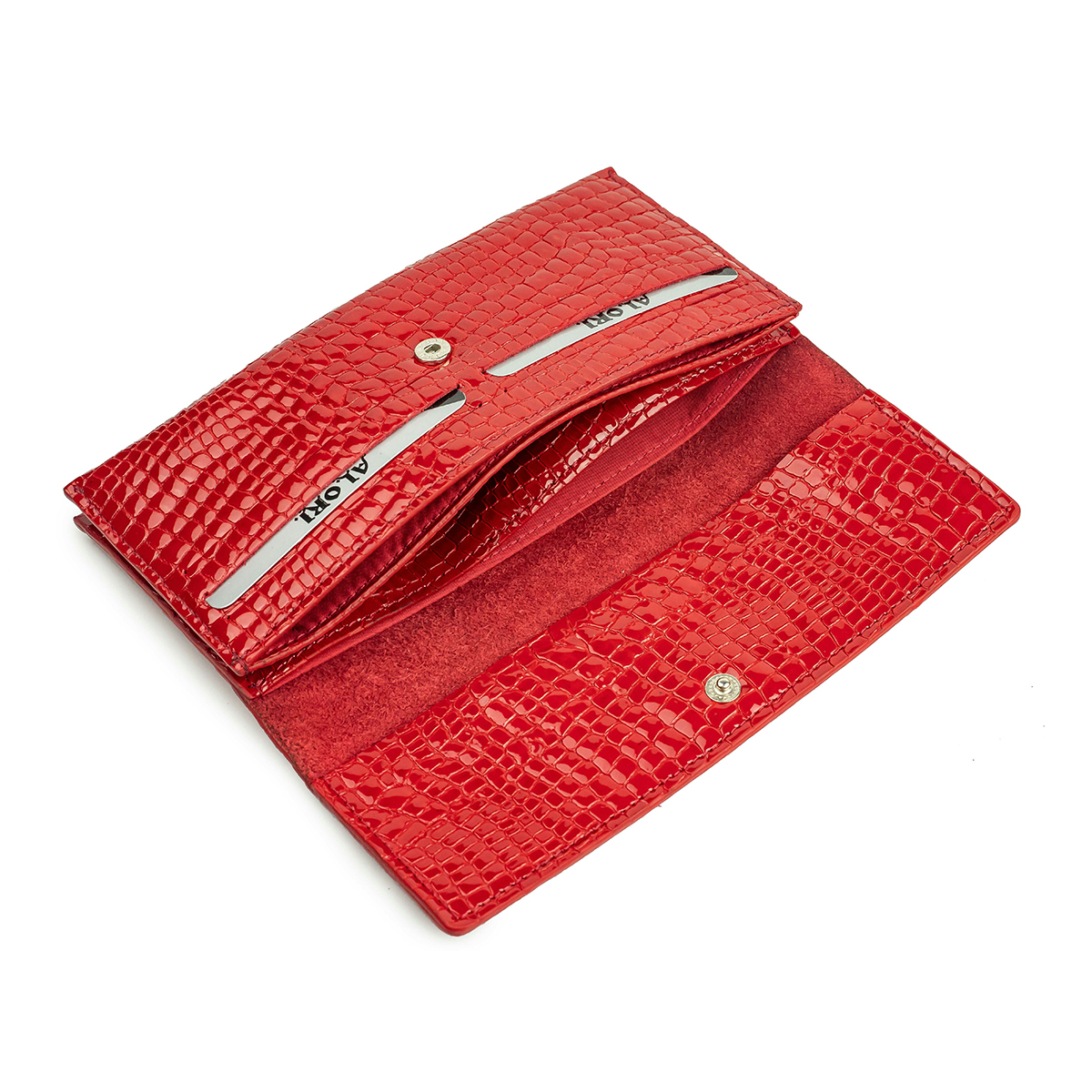 Гаманець виконаний з натуральної лакової шкіри з тисненням під рептилію, червоного кольору.