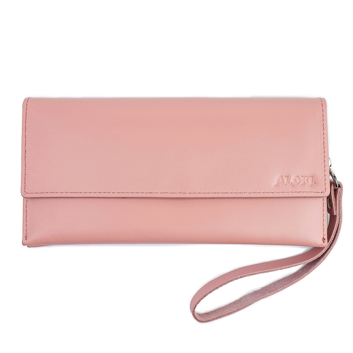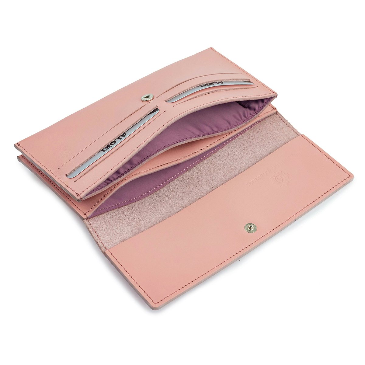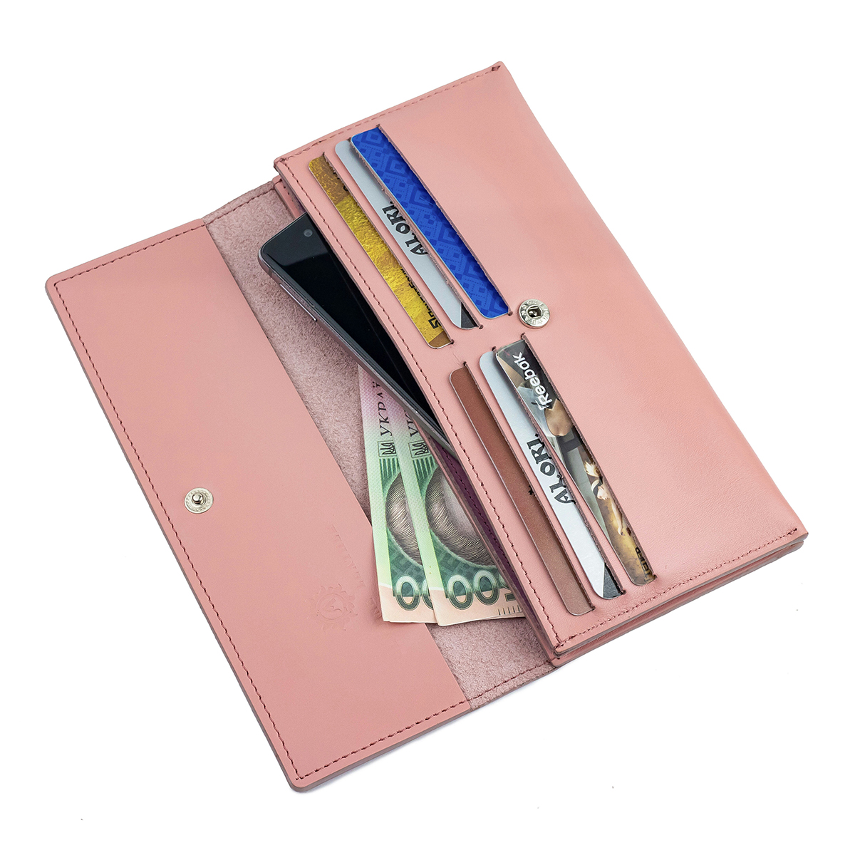 Гаманець виконаний з натуральної гладкої шкіри рожевого кольору.