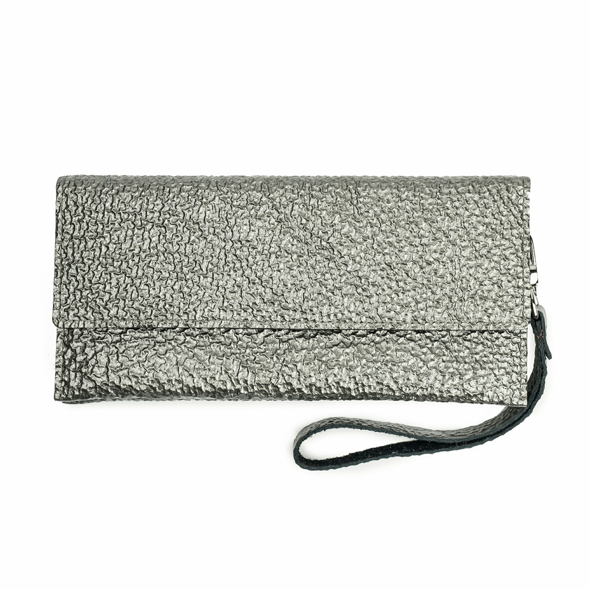 Гаманець виконаний з натуральної шкіри з бугристою фактурою, сріблястого кольору.
