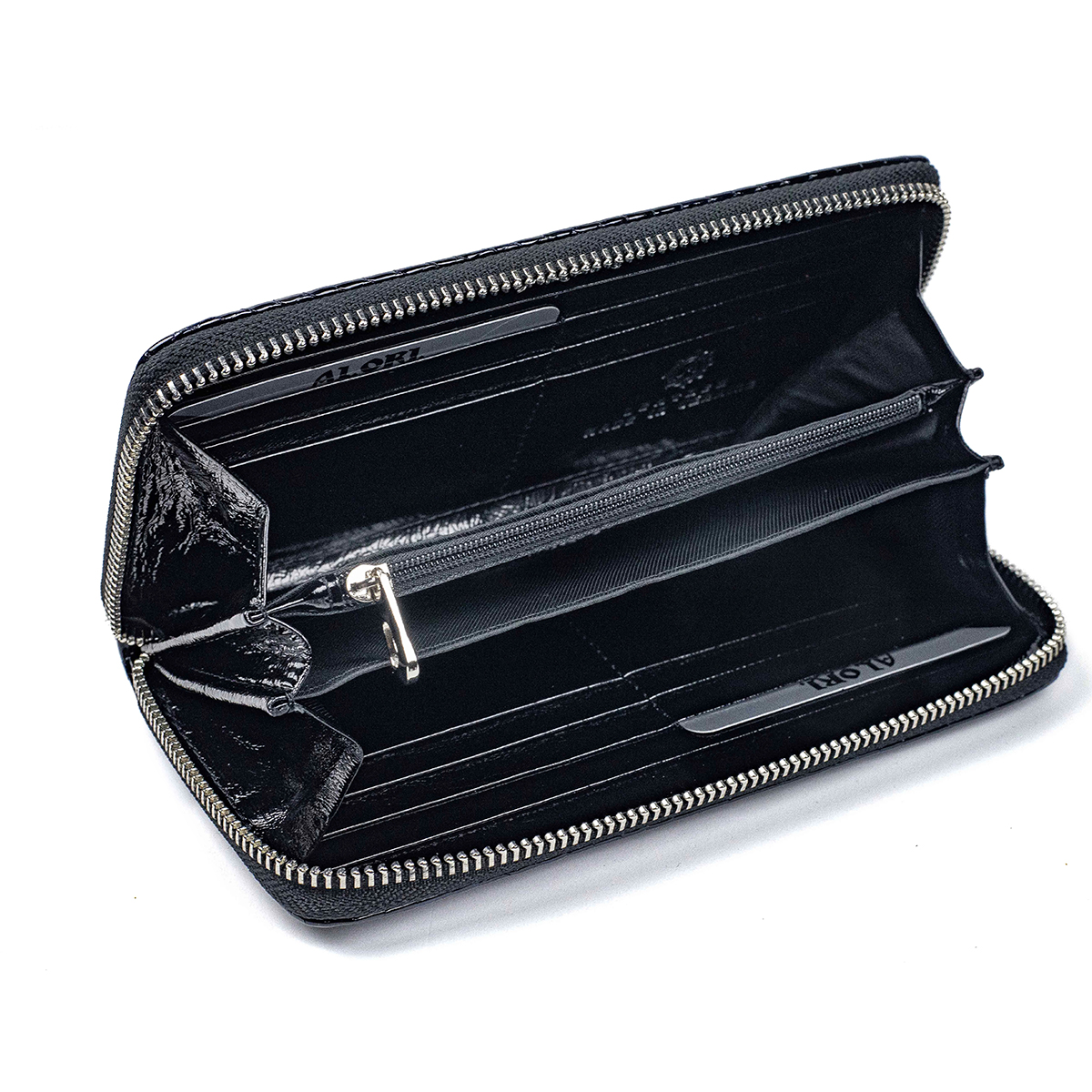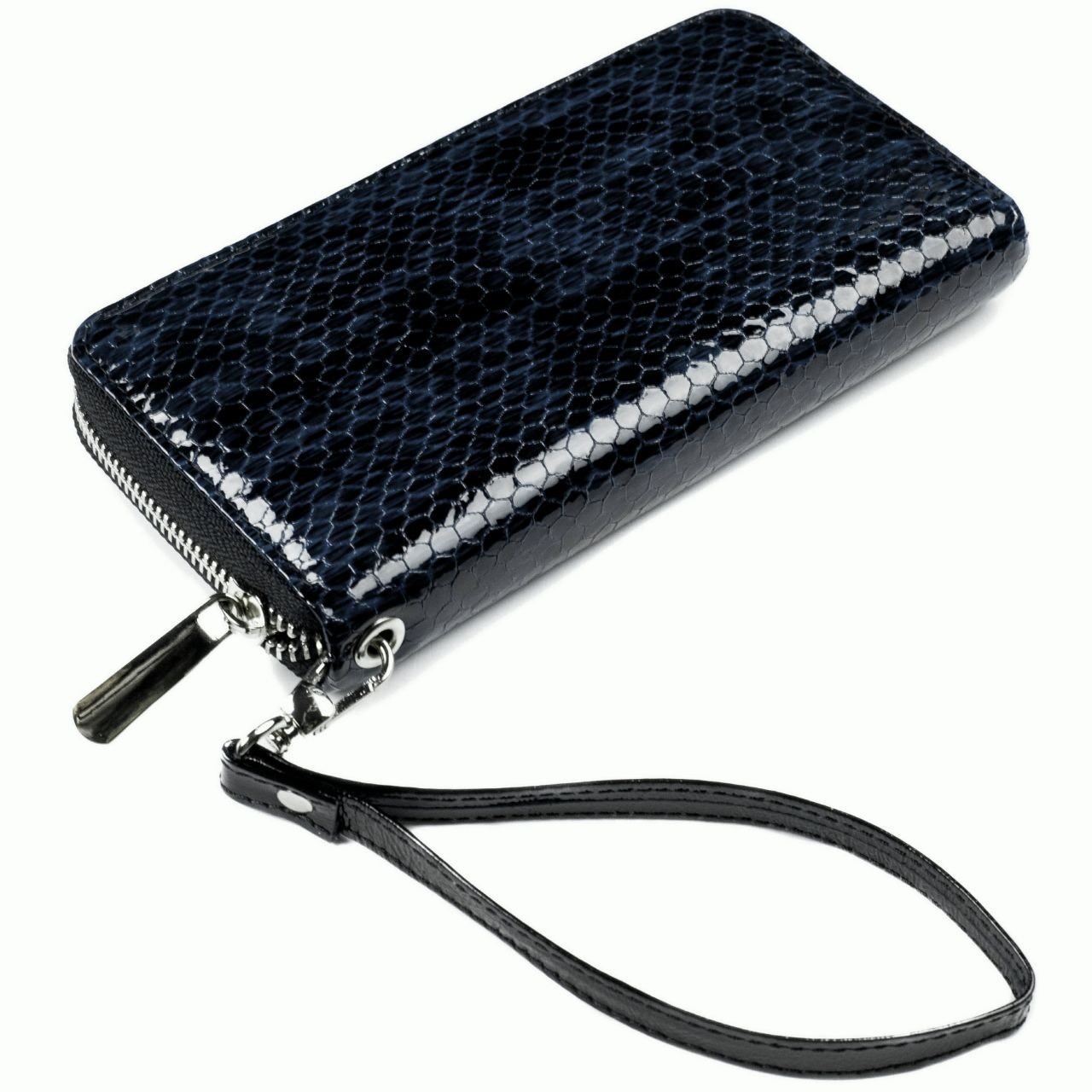 Гаманець виконаний з натуральної шкіри з тисненням під рептилію, чорного кольору.