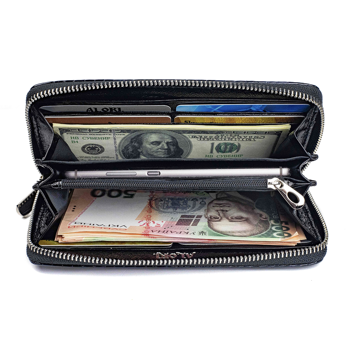 3 основні та 2 додаткові відділи для купюр, 12 осередків для пластикових карток, всередині кишеня на блискавці для монет.