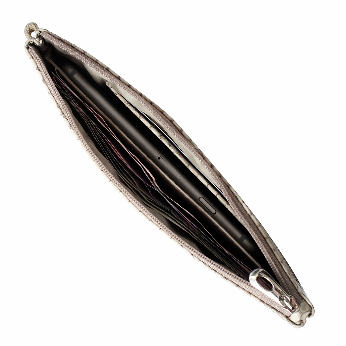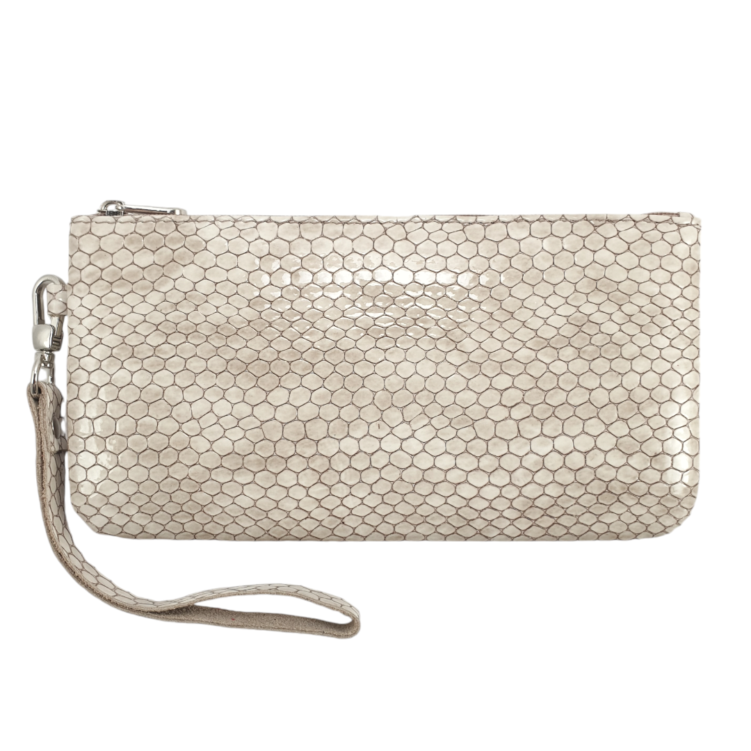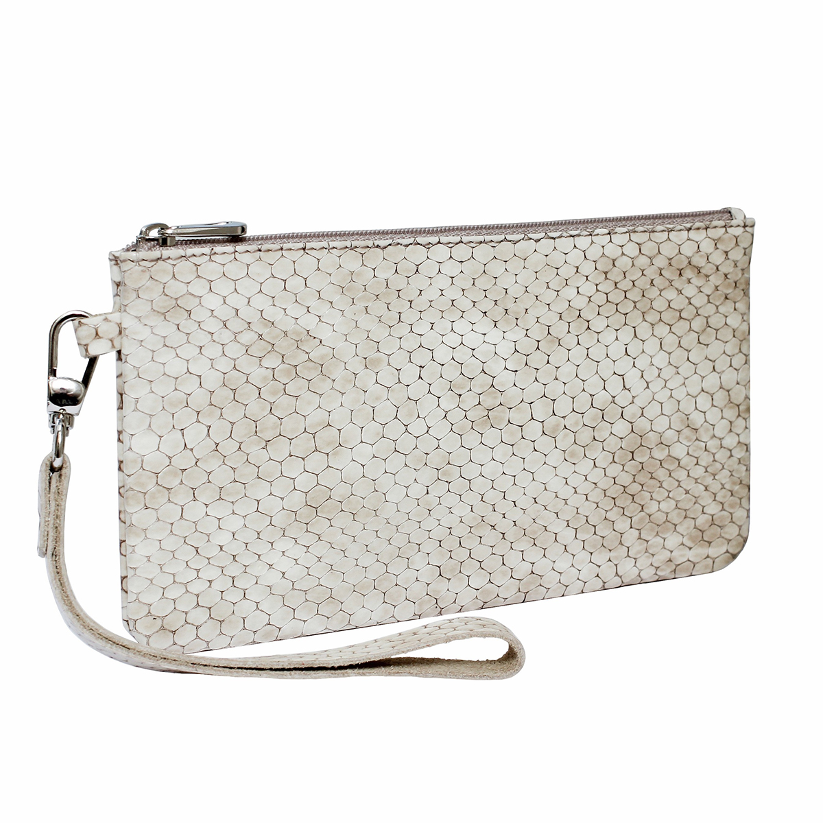 Гаманець-клатч виконаний з натуральної лакової шкіри із тисненням під рептилію, бежевого кольору.