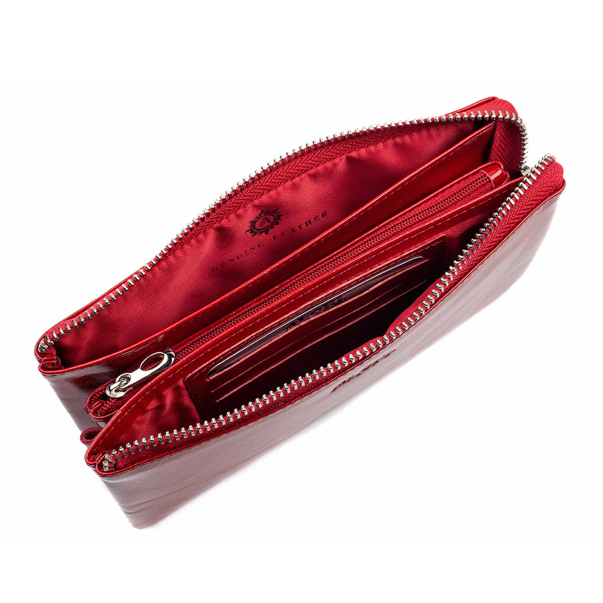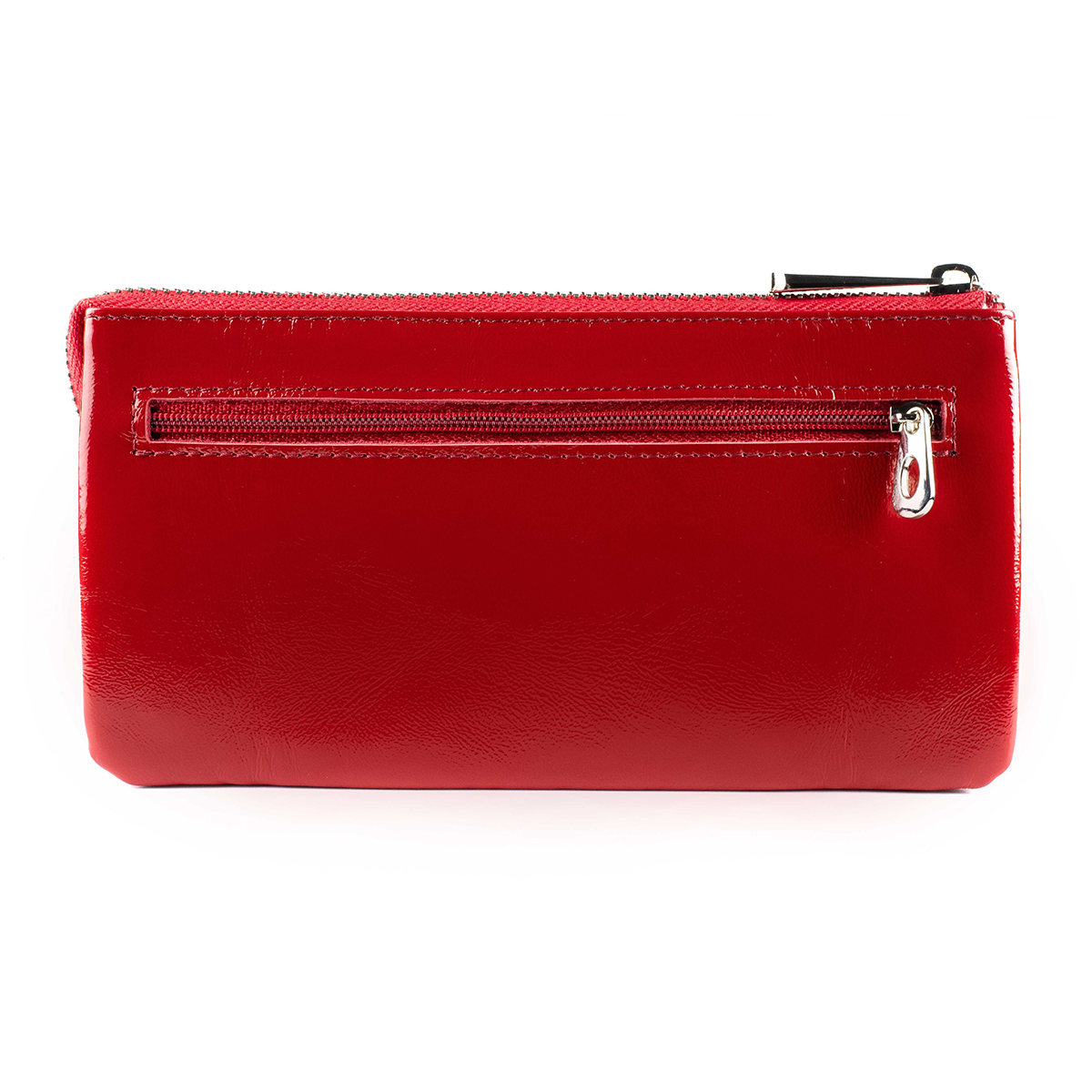 Гаманець-клатч виконаний із натуральної гладкої лакової шкіри, червоного кольору.