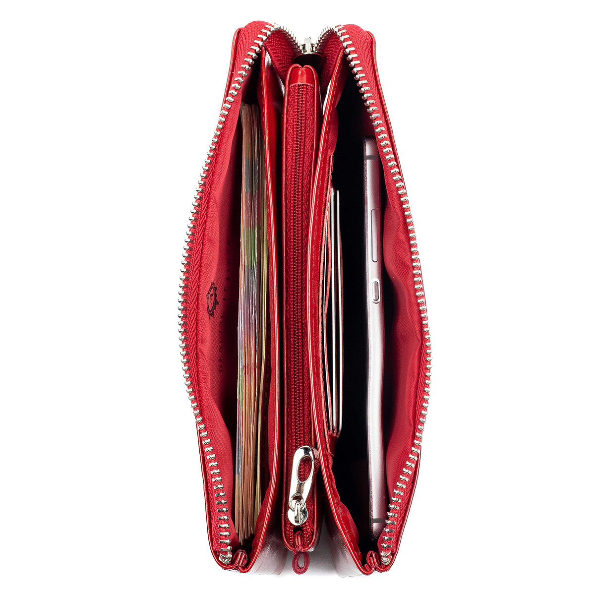 2 основних відділи для купюр, 1 відділ у центрі на блискавці, 3 осередки для пластикових карток, 2 додаткові кишеньки для пластикових карток або інших дрібниць, зовні кишеня на блискавці для монет.