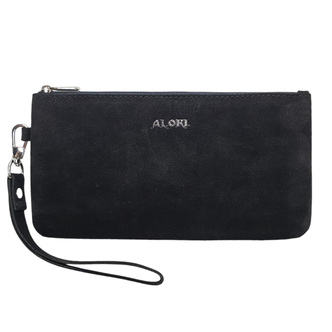 Гаманець-клатч виконаний із натуральної замші, чорного кольору.
