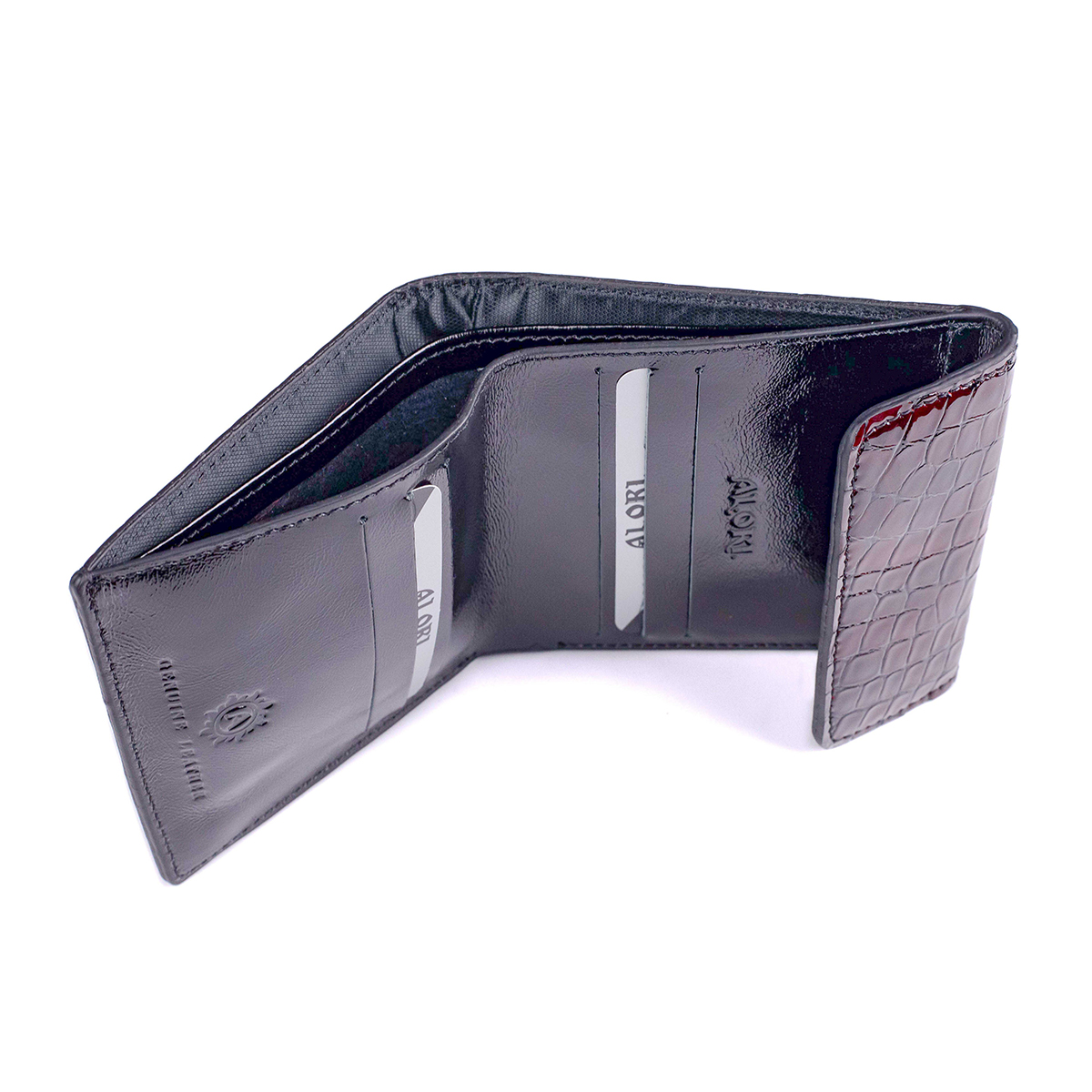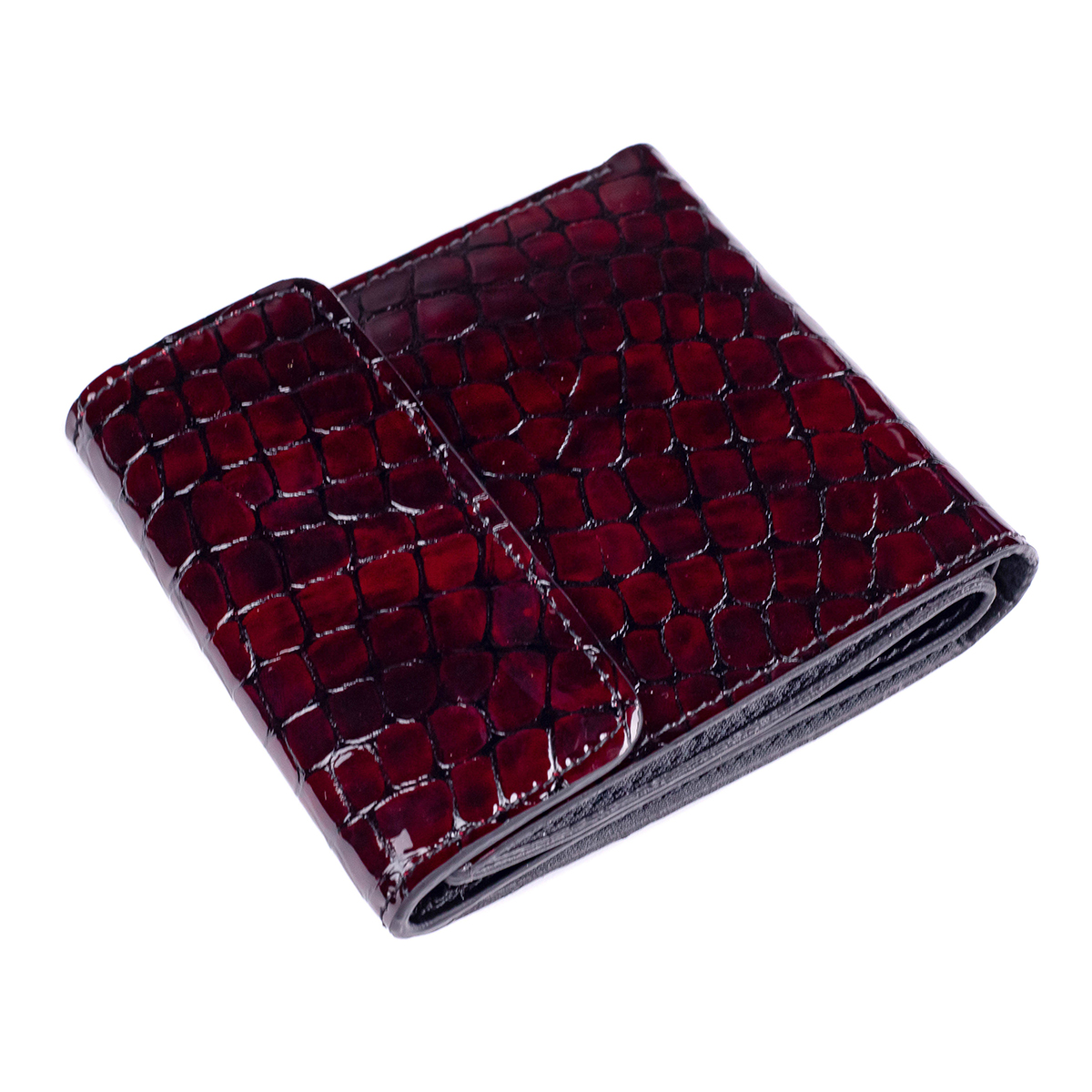 Гаманець-міні виготовлений з натуральної лакової шкіри з тисненням під рептилію, бордового кольору.