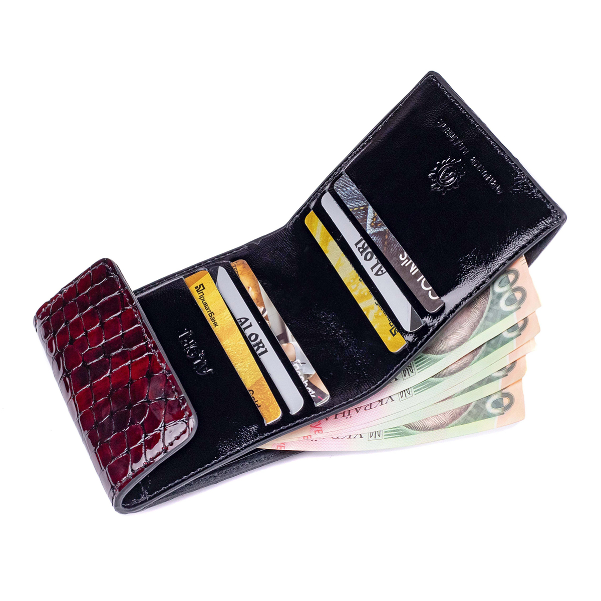 2 відділи для купюр, 6 осередків для пластикових карток, зовні кишеня для монет.