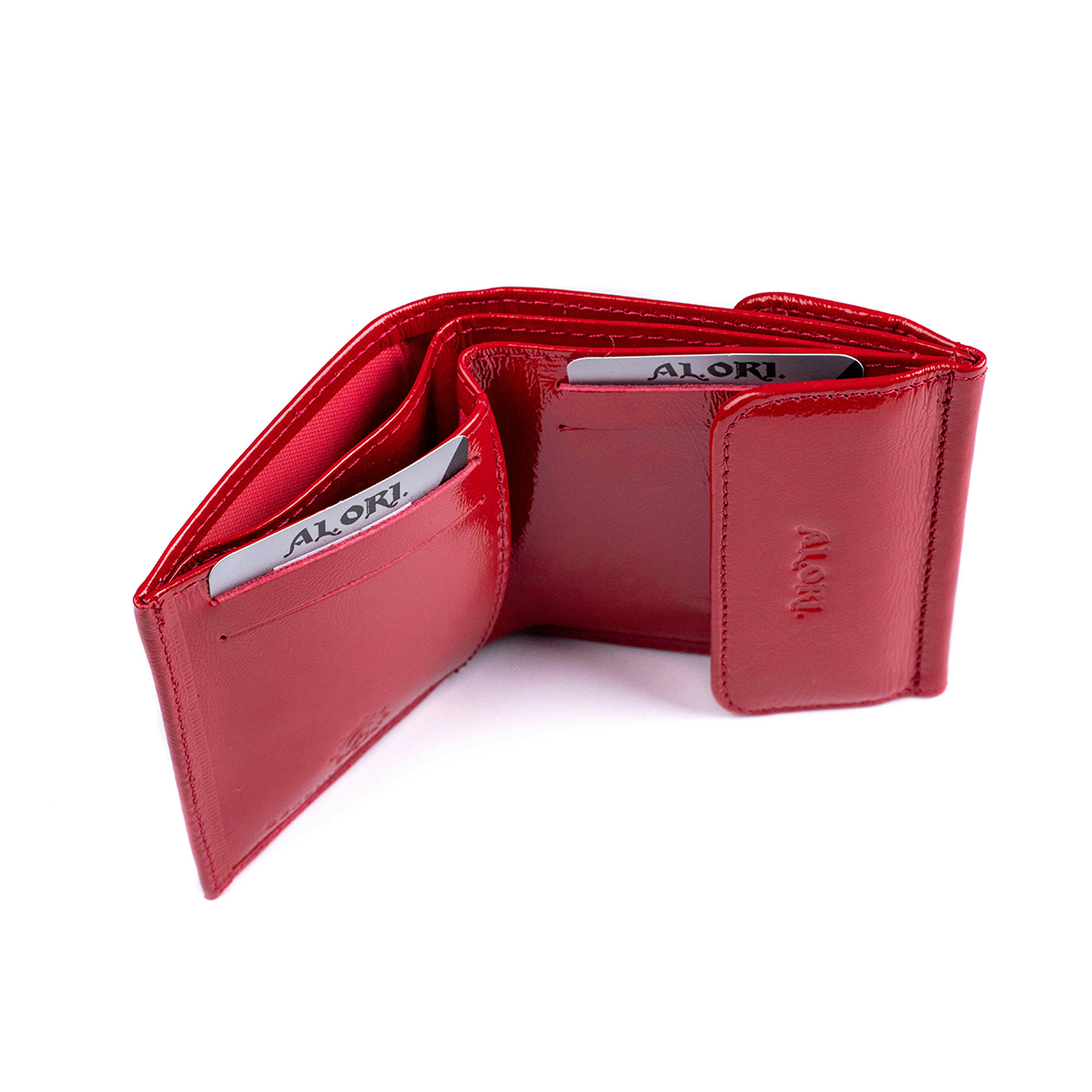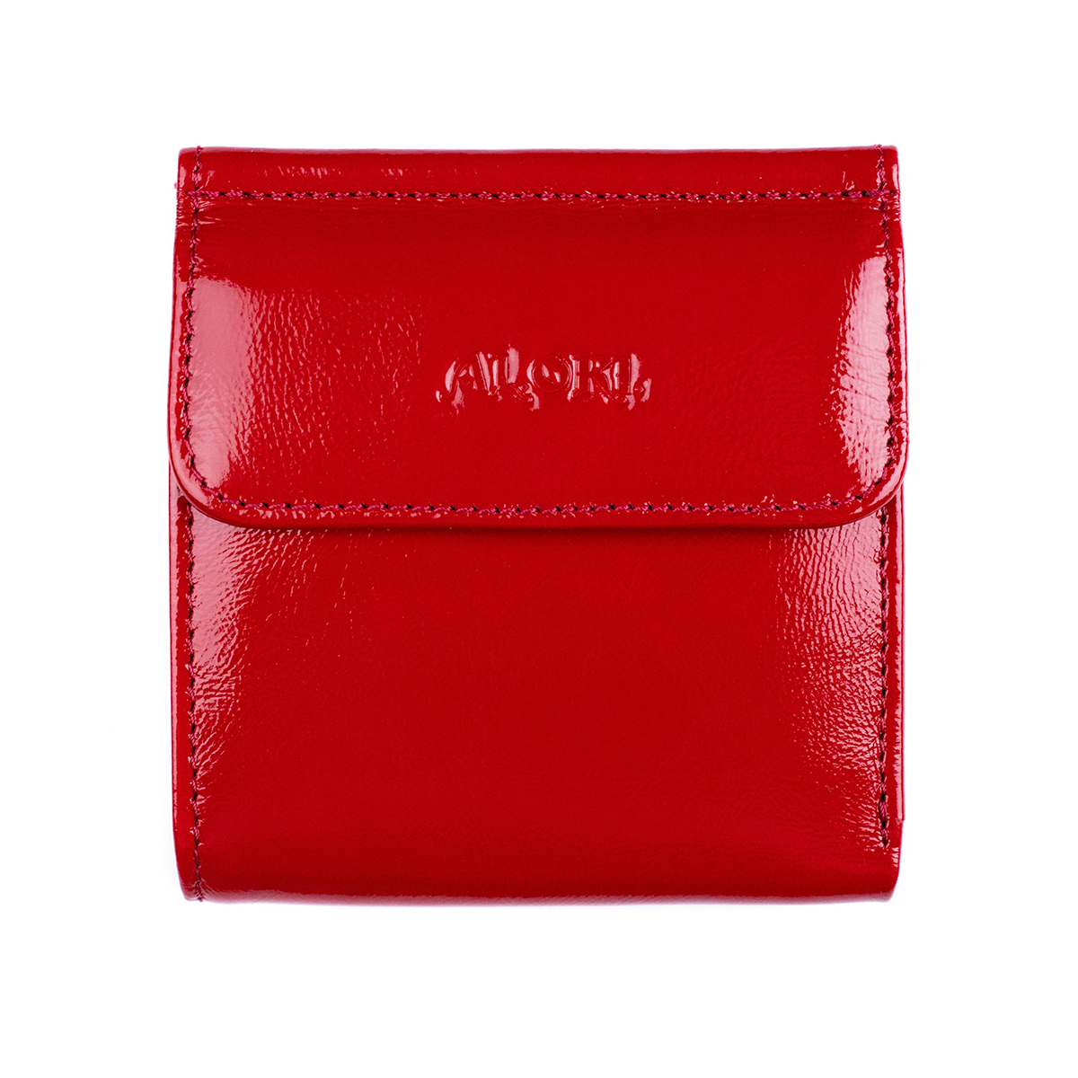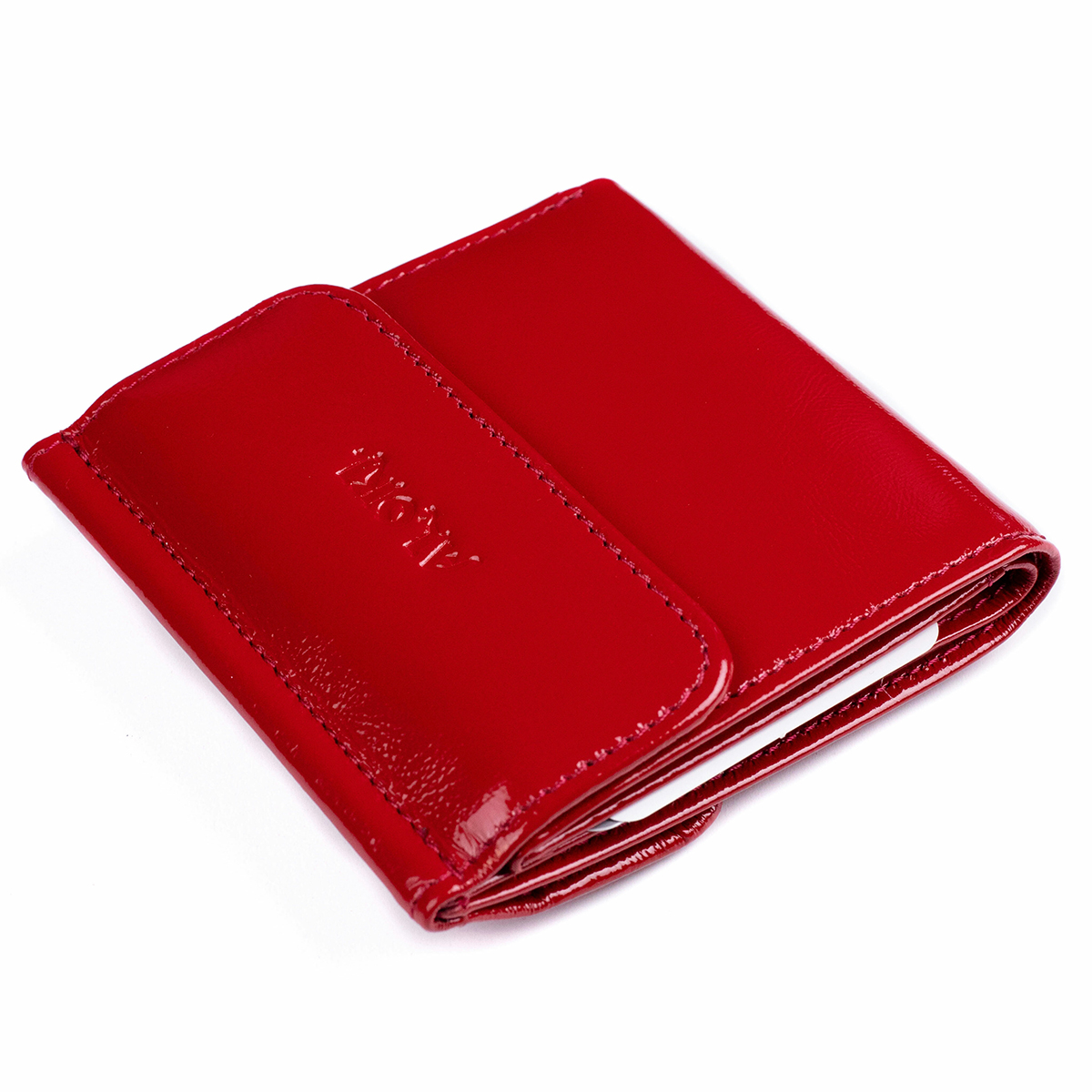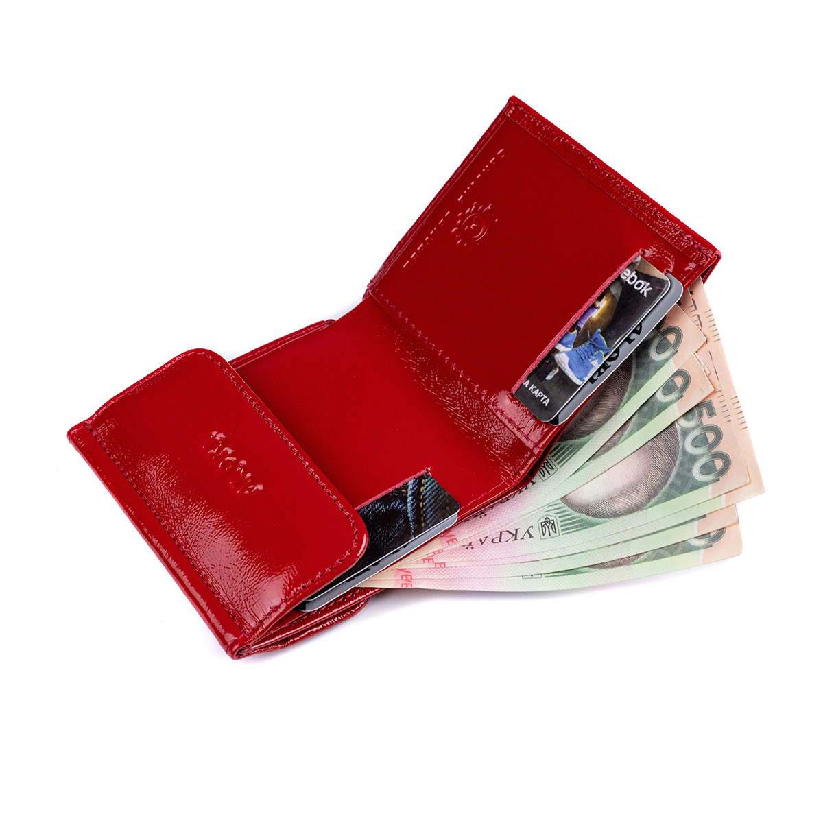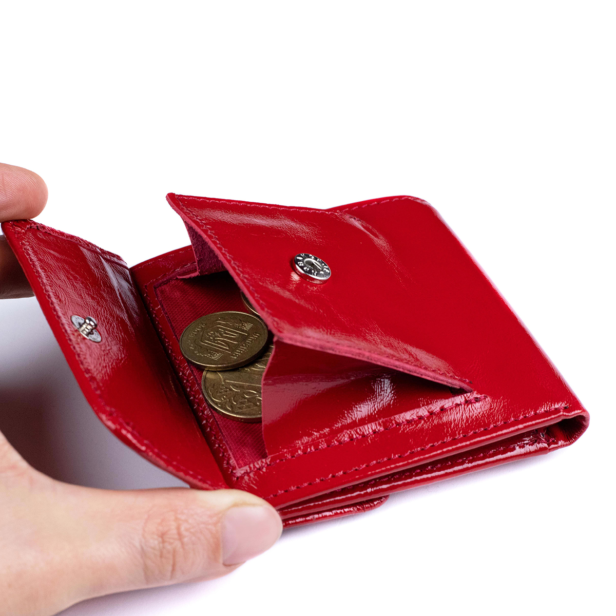 Гаманець-міні виготовлений з натуральної гладкої лакової шкіри, червоного кольору.
