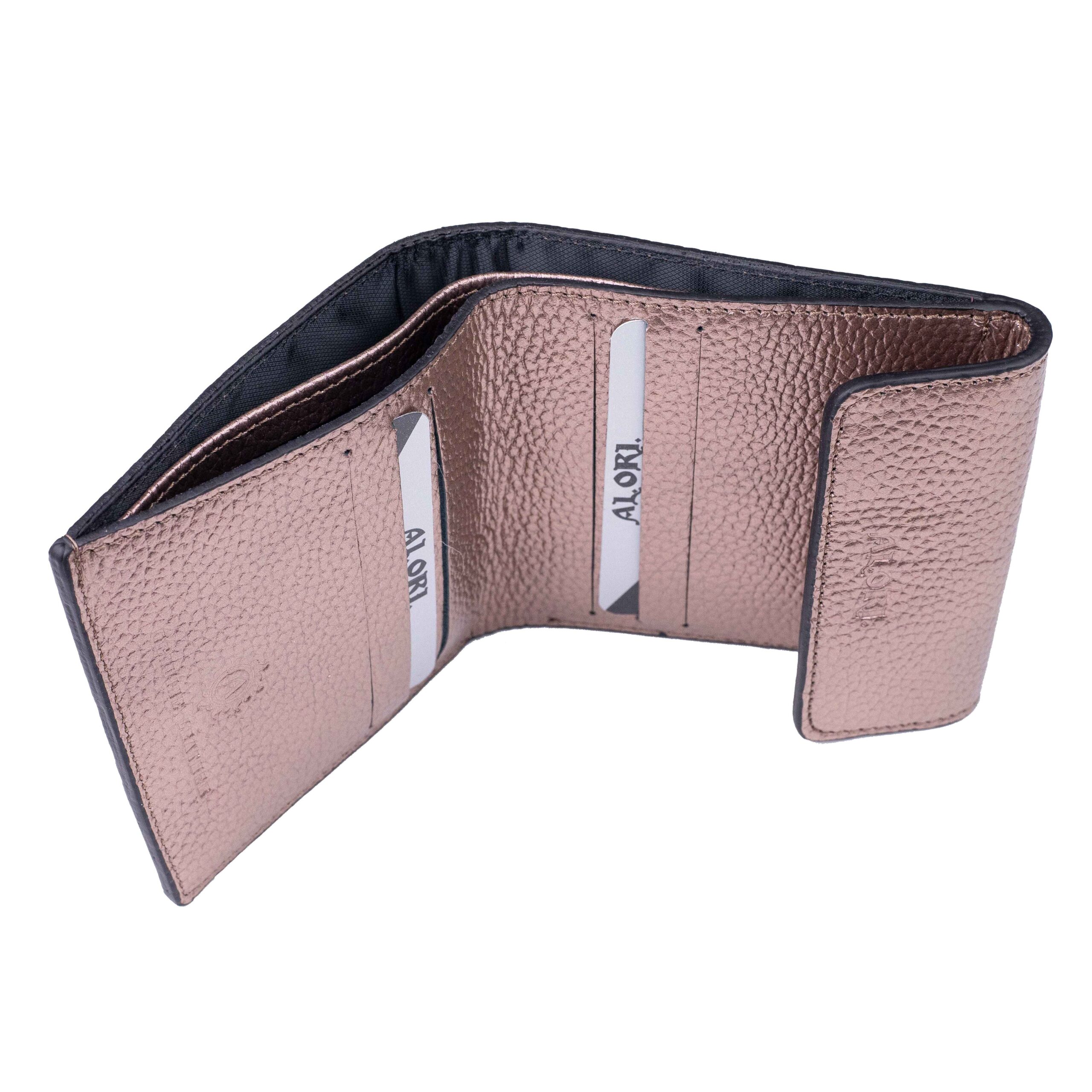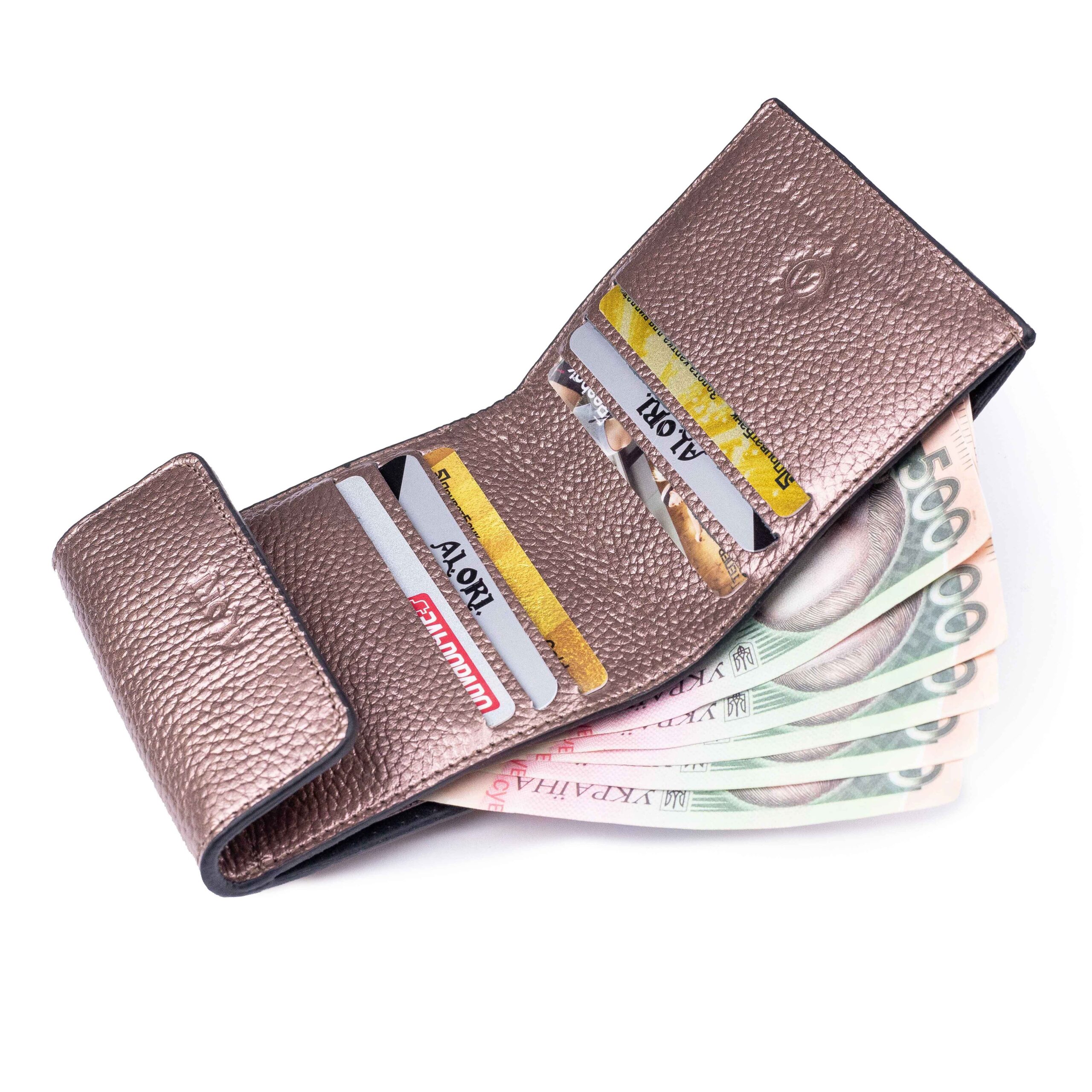 2 відділи для купюр, 6 осередків для пластикових карток, зовні кишеня для монет.
