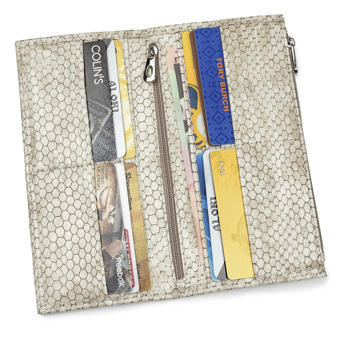 2 основних та 1 додатковий відділ для купюр у центрі на блискавці, 12 осередків для пластикових карток, зовні кишеня на блискавці для монет.