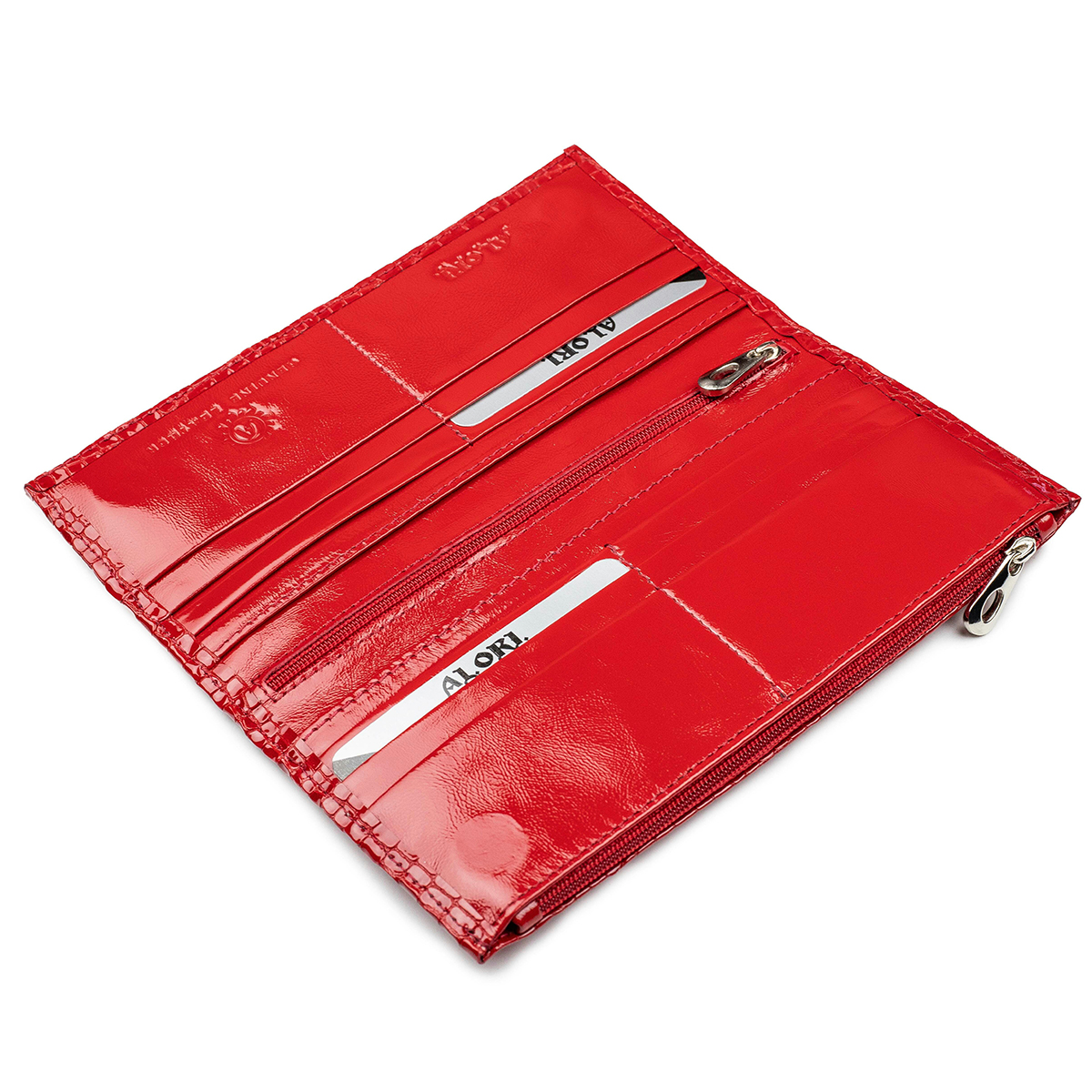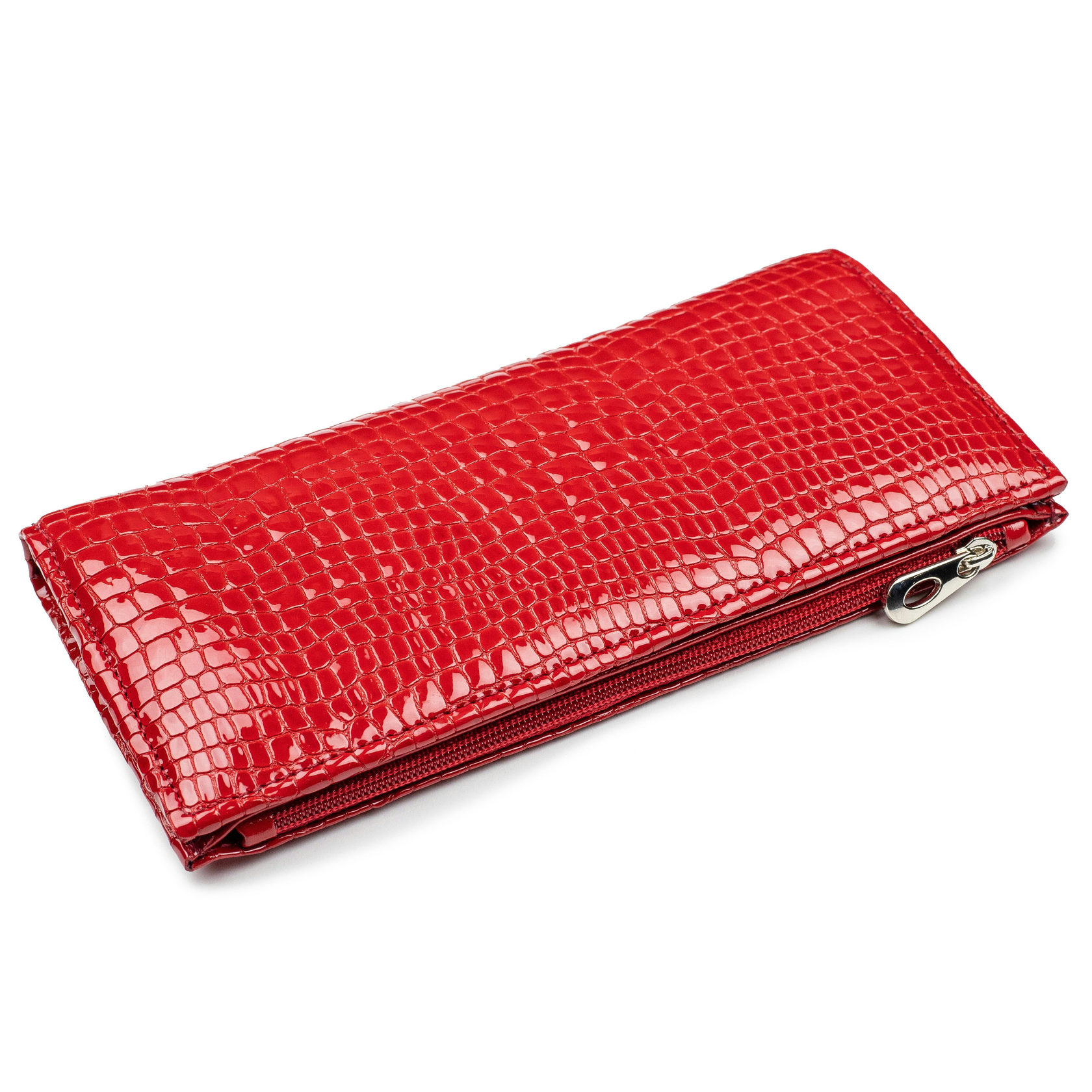 Гаманець виконаний з натуральної лакової шкіри із тисненням під рептилію, червоного кольору.