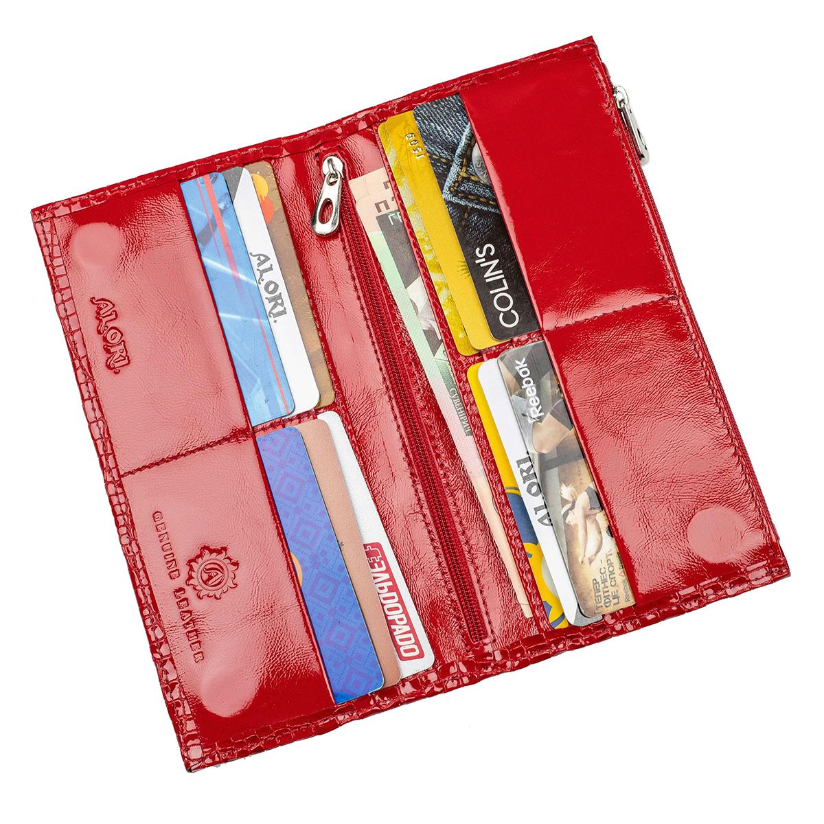 2 основних та 1 додатковий відділ для купюр у центрі на блискавці, 12 осередків для пластикових карток, зовні кишеня на блискавці для монет.