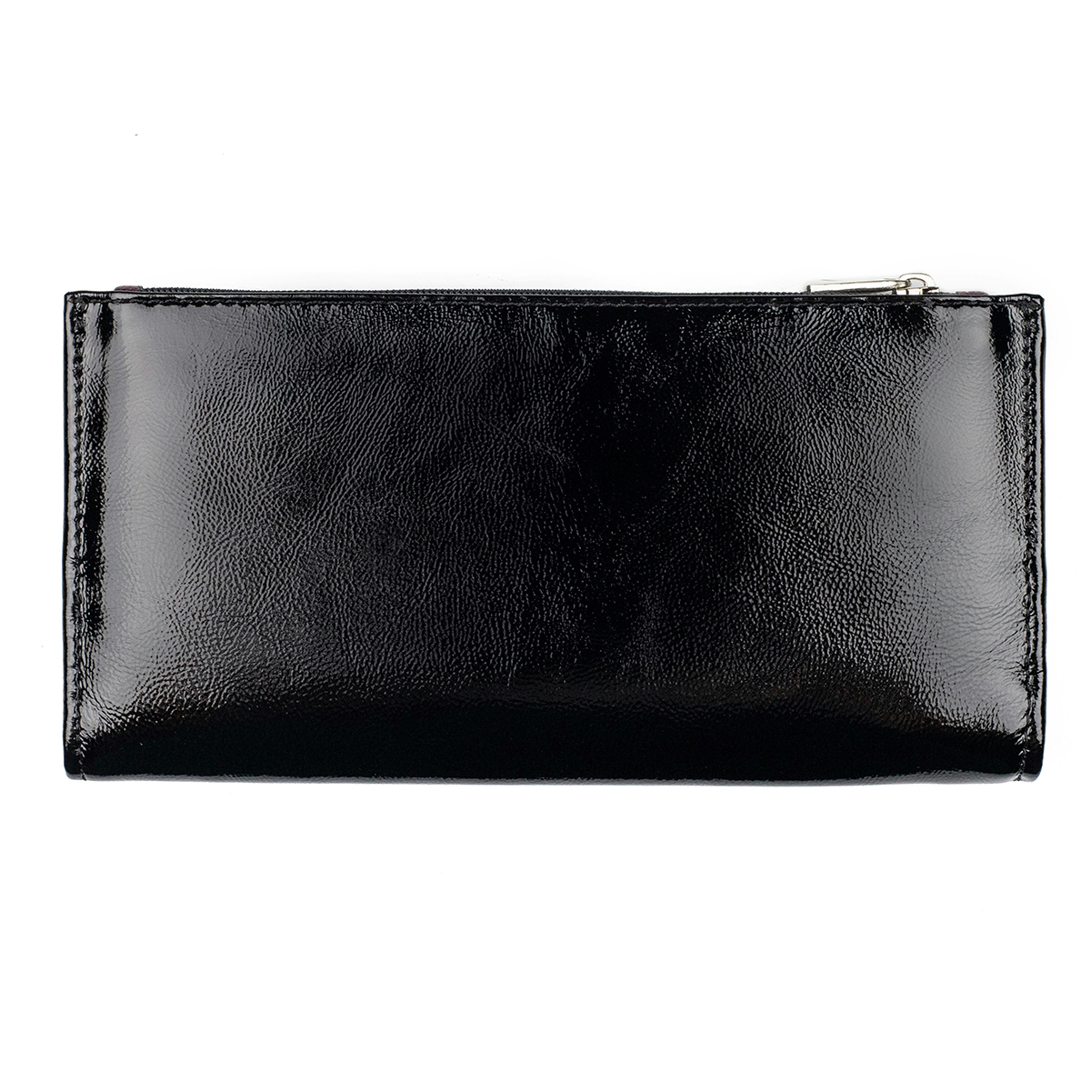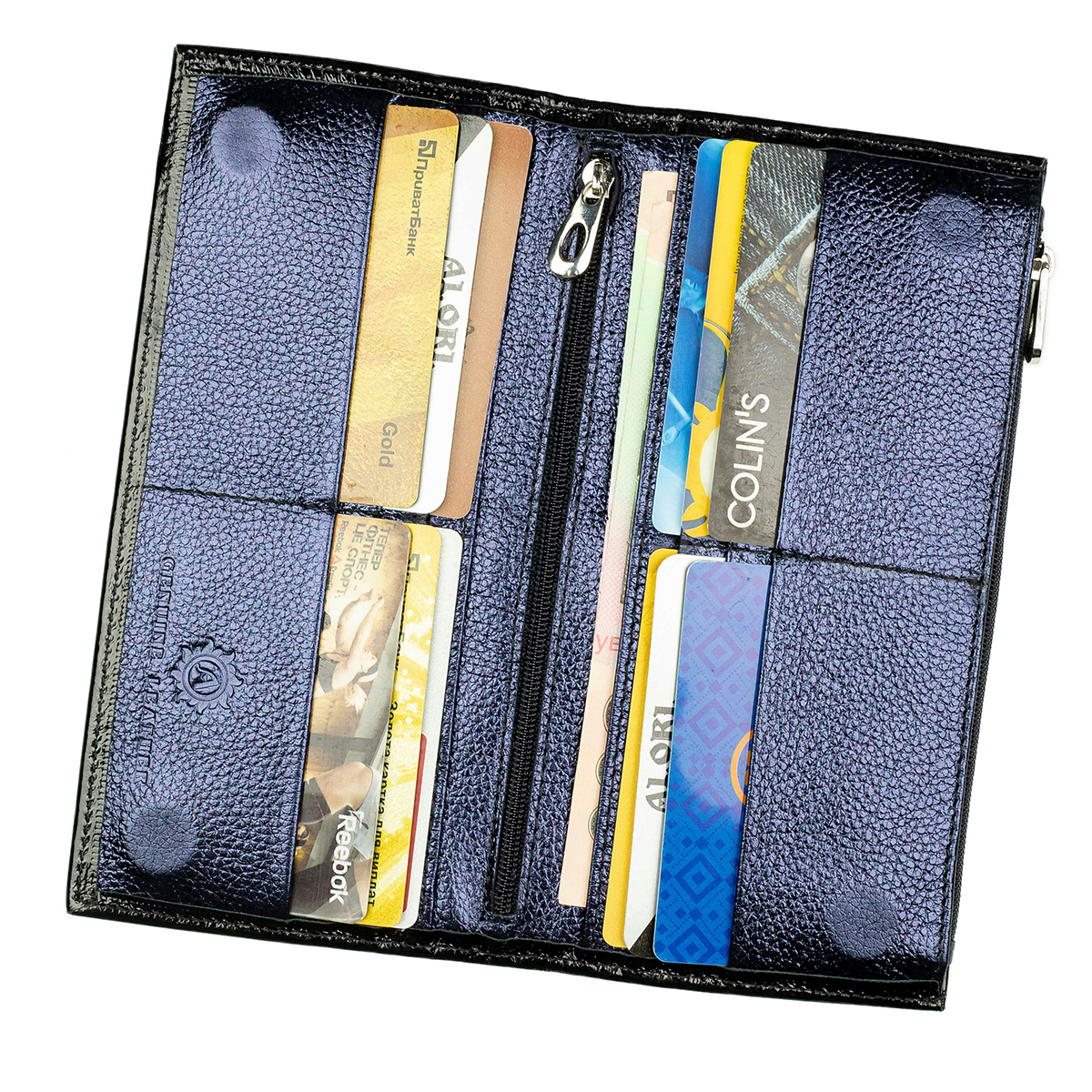 2 основних та 1 додатковий відділ для купюр у центрі на блискавці, 12 осередків для пластикових карток, зовні кишеня на блискавці для монет.