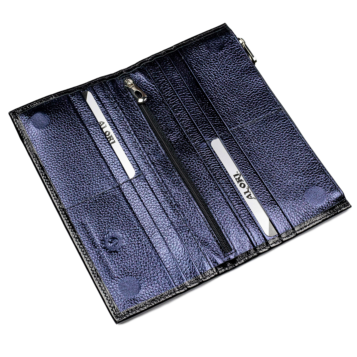 Гаманець виконаний із натуральної гладкої лакової шкіри чорного кольору. Внутрішня частина гаманця виготовлена з натуральної шкіри синього кольору.