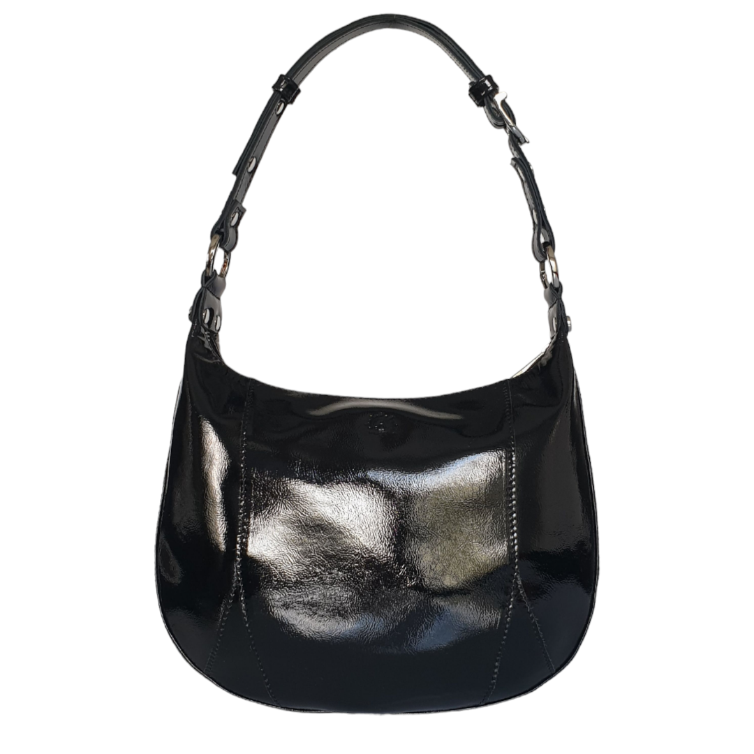 Сумка виконана з натуральної гладкої лакової шкіри, чорного кольору.