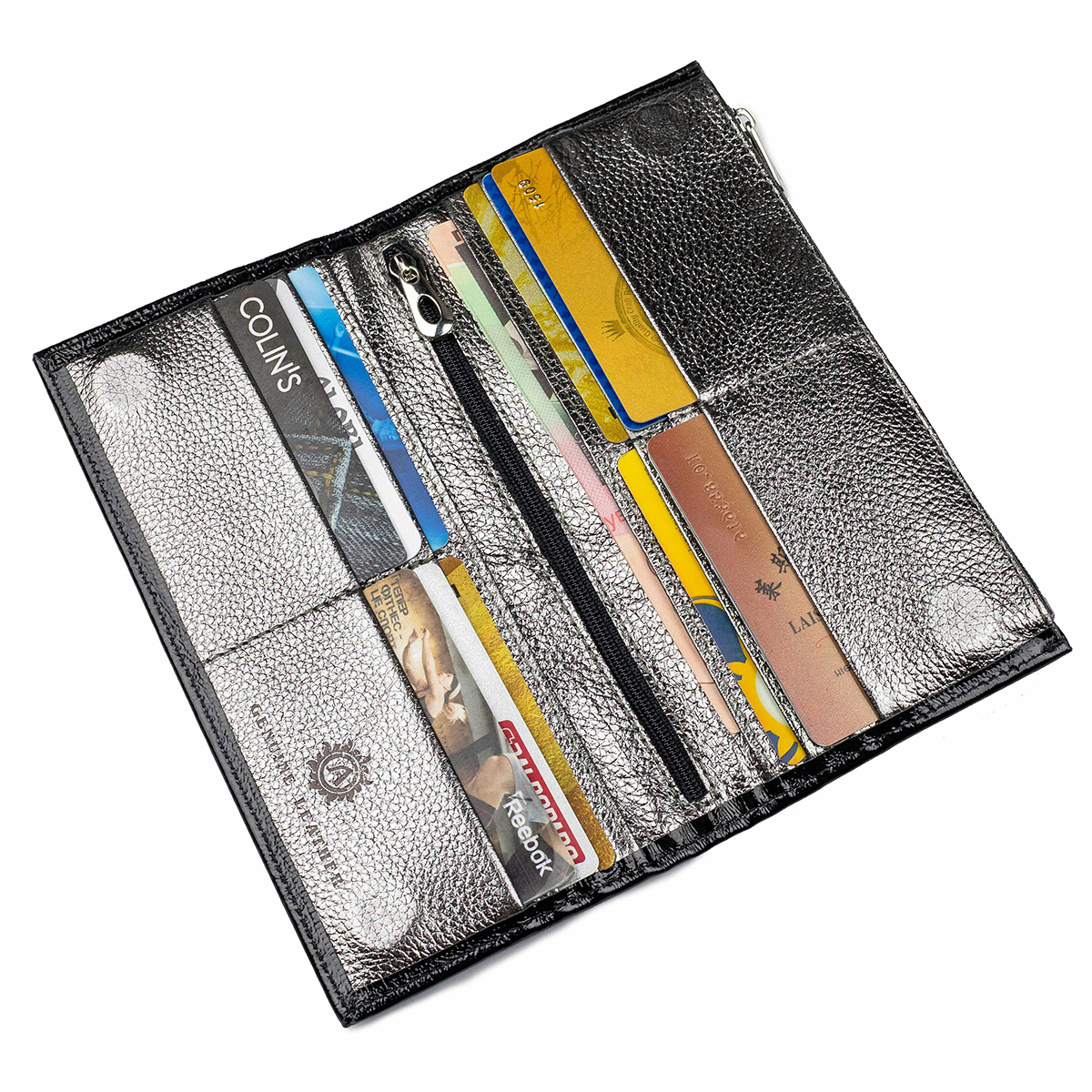 Гаманець виконаний із натуральної гладкої лакової шкіри чорного кольору. Внутрішня частина гаманця виготовлена з натуральної шкіри сріблястого кольору.